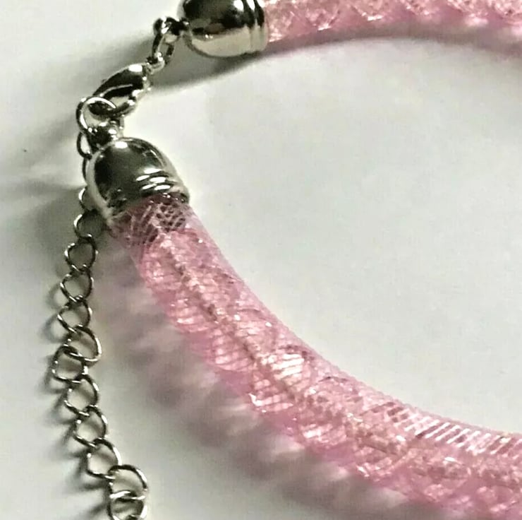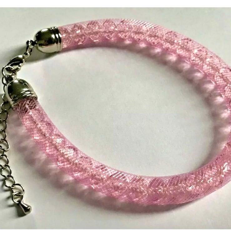 A Hand Crafted Mesh Bracelet filled with Pale Pink Beads.