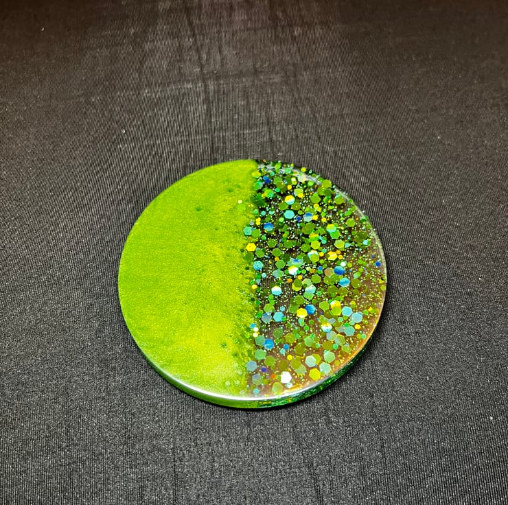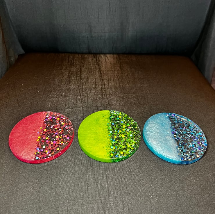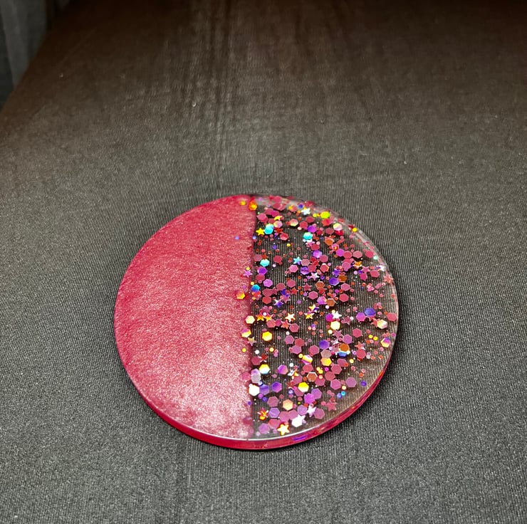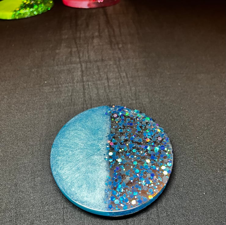 Coasters are half mica powder and half clear with glitter. The coasters are approximately 86mm in diameter.
