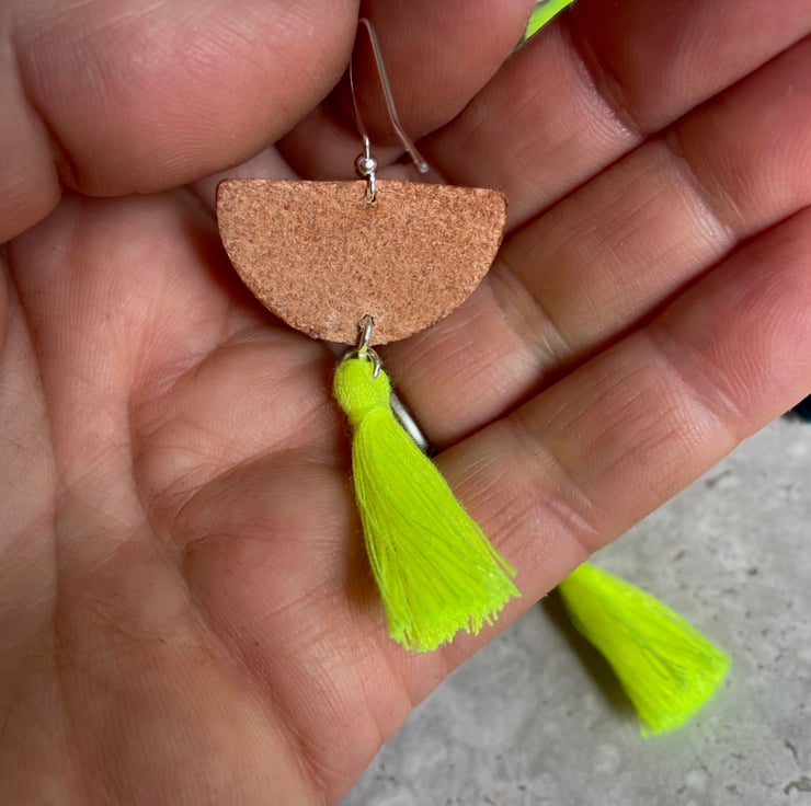 Made from: Hand-painted leather, finished with a vibrant neon yellow tassel