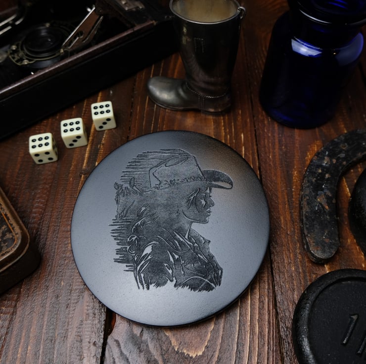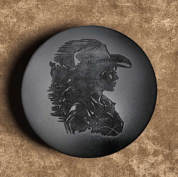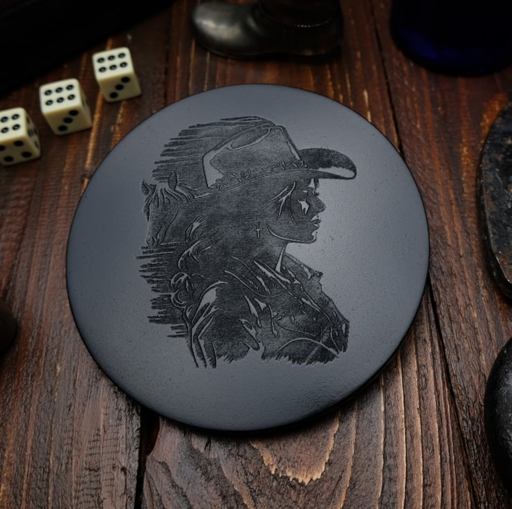This handcrafted coaster features an elegantly engraved image of a cowgirl, capturing the spirit and resilience of the American frontier. The detailed engraving portrays the cowgirl in a classic pose, showcasing her adventurous and independent nature. Made from durable stonecast, ideal for display, this coaster adds a distinctive, Western-inspired accent to any space.The design features a smooth, shiny surface that catches the light without being overly glossy, highlighting the intricate engraving and craftsmanship while maintaining a refined, understated elegance. It’s a perfect gift for those who admire Western culture, cowboy aesthetics, or unique artisanal craftsmanship.