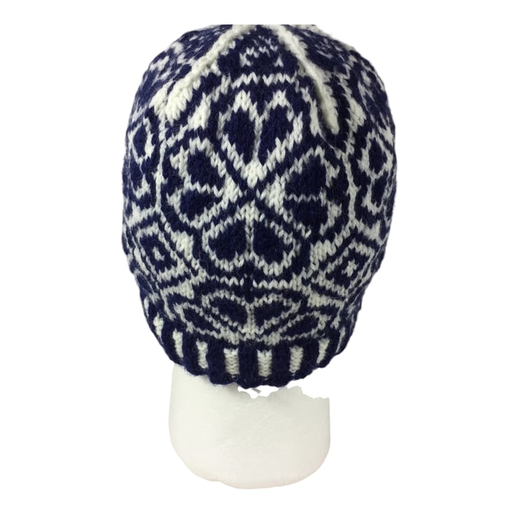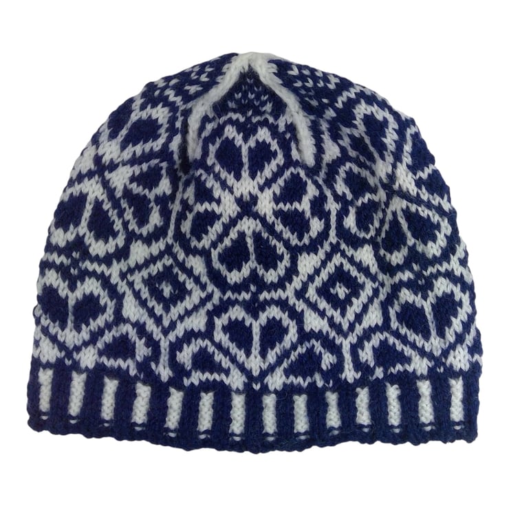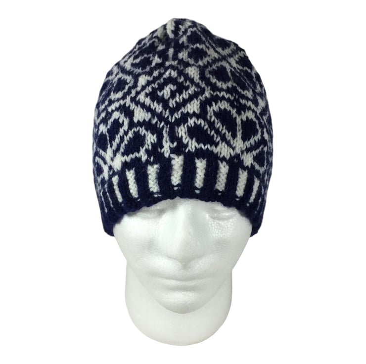 A hand knitted very pretty hat. The yarn is a a soft 65% wool 35% alpaca wool. This yarn is a heavier weight than my usual stranded hats, so nice and warm! The main yarn is a navy blue colour. The contrast is white.