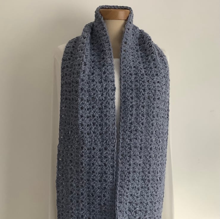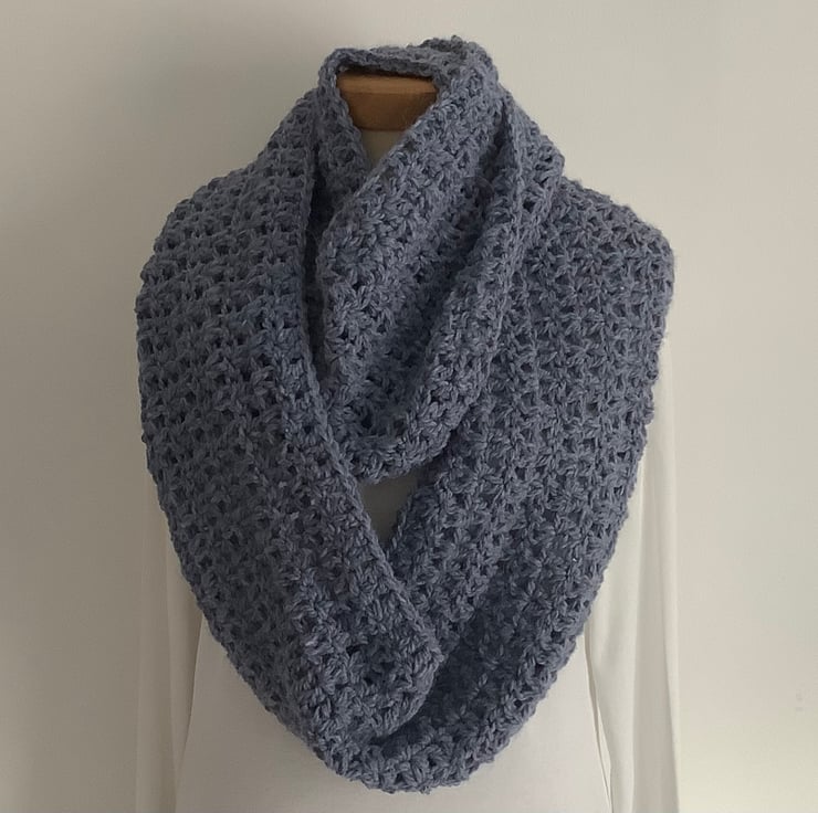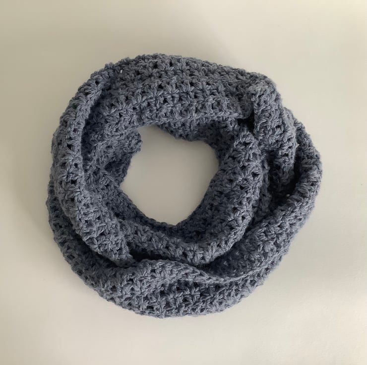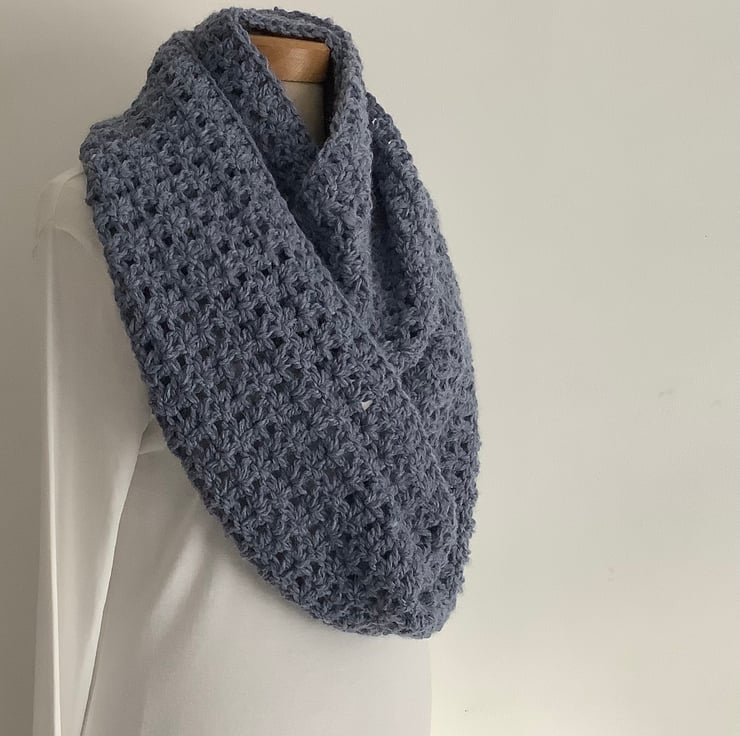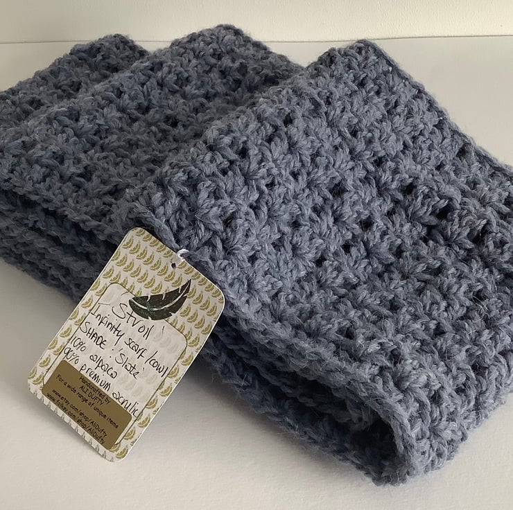 I have designed and crocheted this double-wrap infinity scarf / neck-warmer in a lovely, squidgey soft alpaca blend yarn. An ' endless loop' that can than can be worn as is or wrapped twice ! ( 1st / main picture shows 2 wraps ) . Hypoallergenic , lightweight alpaca / acrylic blend .