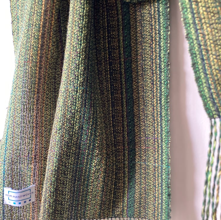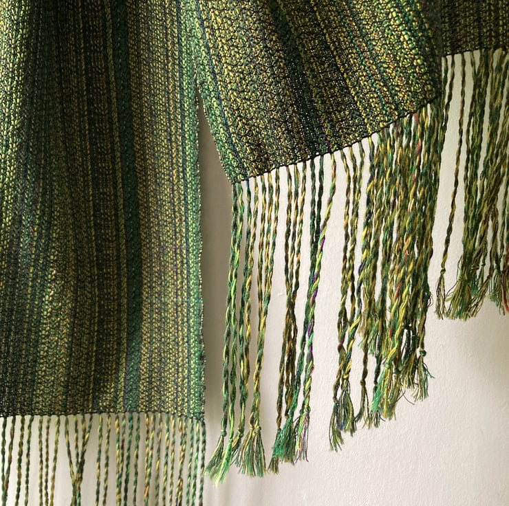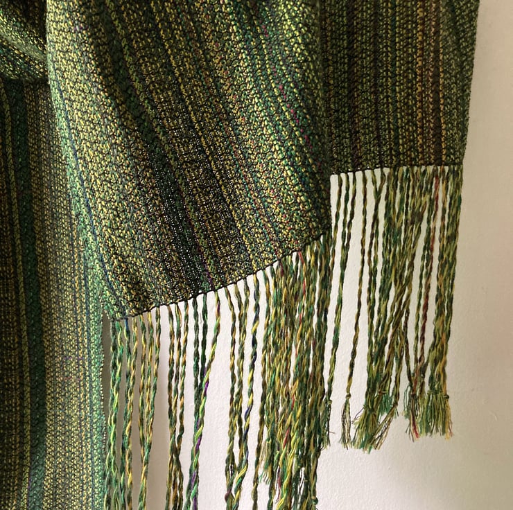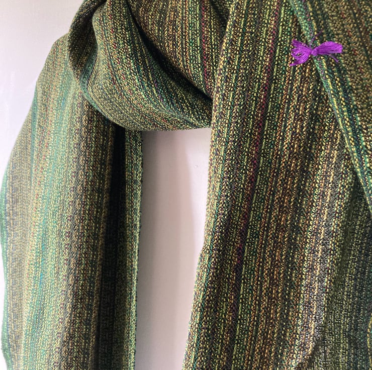 A handwoven wrap scarf in a tiny twill draft in over 40 shades of green, shot through with glimpses of wildflowers in the height of summer. The colours are warped