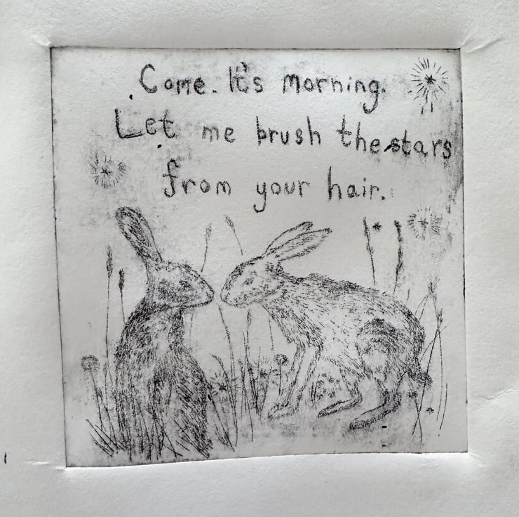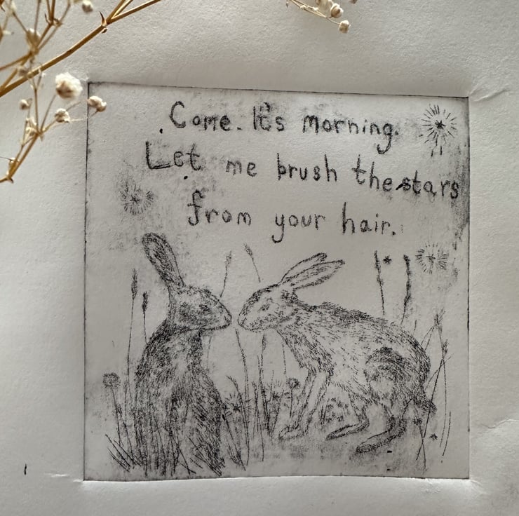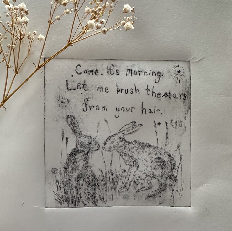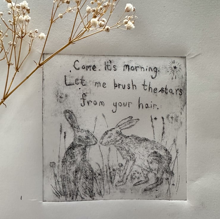 An original hand printed drypoint etching print depicting two hares amongst the meadow grass, with dandelions, stars and the poem,