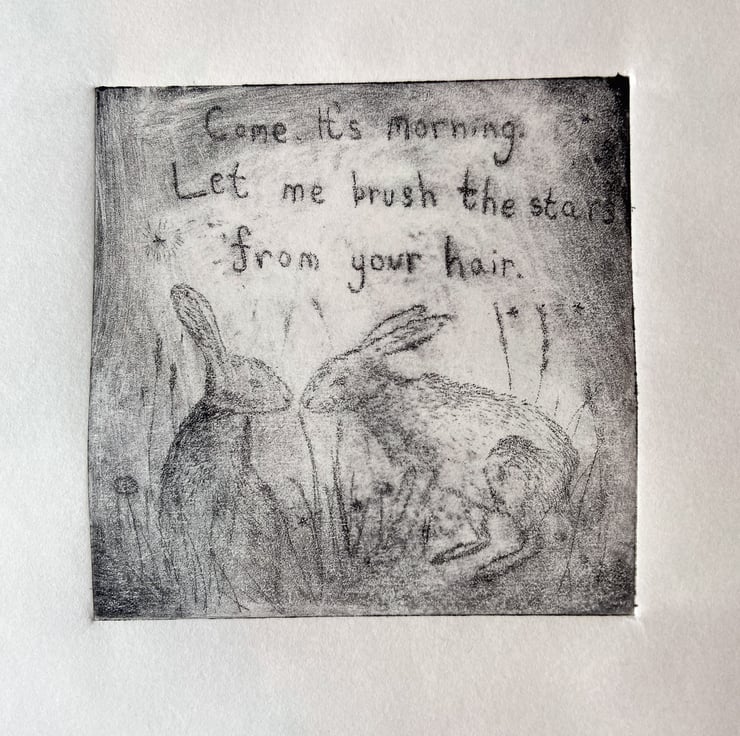 An original hand printed drypoint intaglio etching print depicting two hares amongst the meadow grass, with dandelions, stars and the poem,