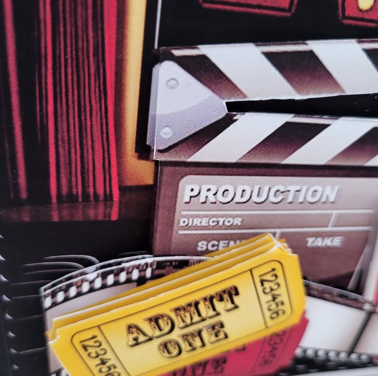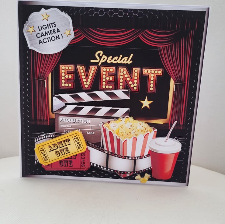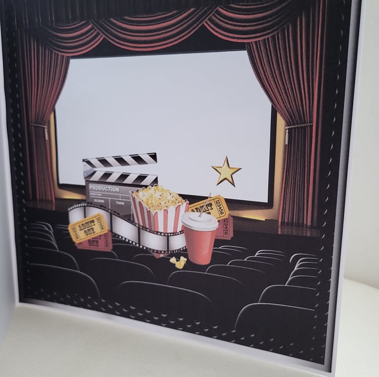 This card would be perfect for a cinema or theatre lover. It measures approx 8 x 8 inches and has been layered up to create depth. Inside the card has an insert which matches the front with room for you to write your message.