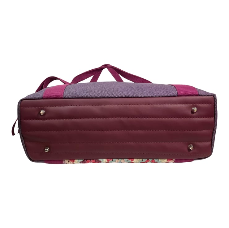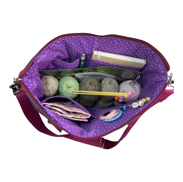 Externally is a feature pocket in granny square print cotton that has a magnetic snap closure. 2 webbing handles and a fully removable and adjustable strap complete the design. Also included is a lobster clasp for your stitch markers, keys or used as a yarn guide.