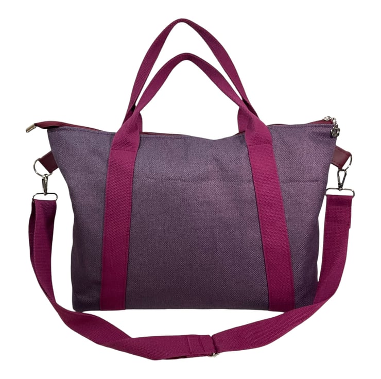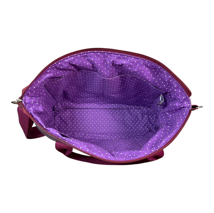 The outer is in a Heather purple fabric and the lining is purple with white polka dot fabric.