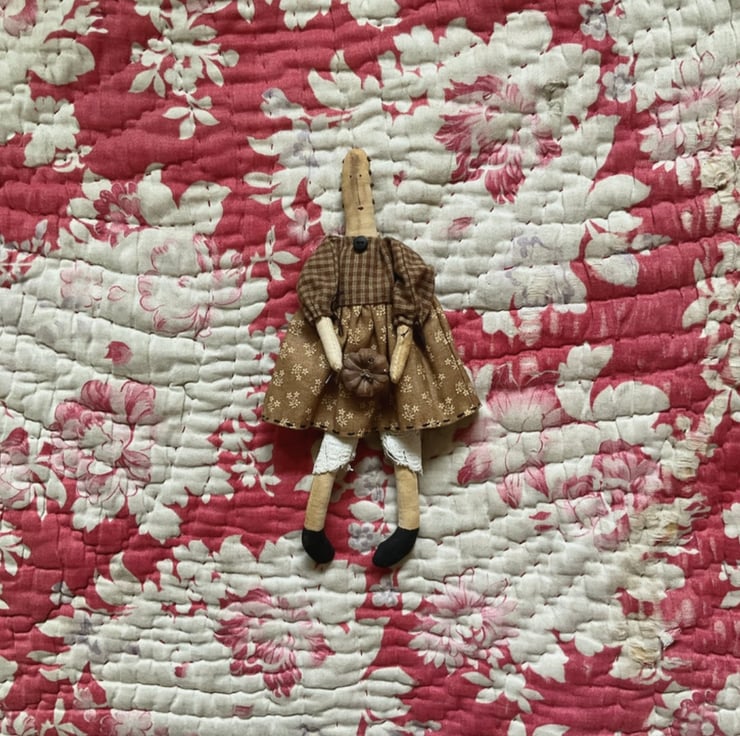 The body is made from tea stained cotton. She is wearing bloomers made from vintage lace and her dress is made from two primitive, homespun fabrics, finished off with cuff ties and a mini button on the bodice. She is holding a dried teeny pumpkin.