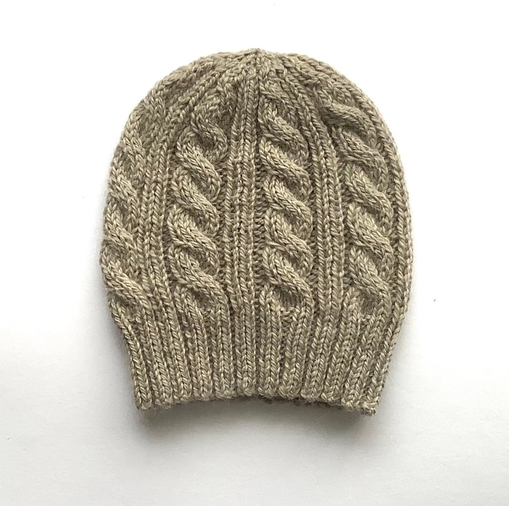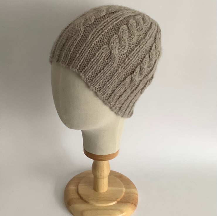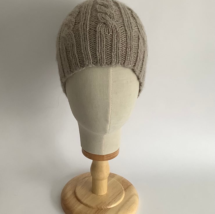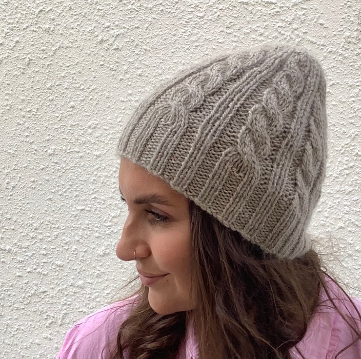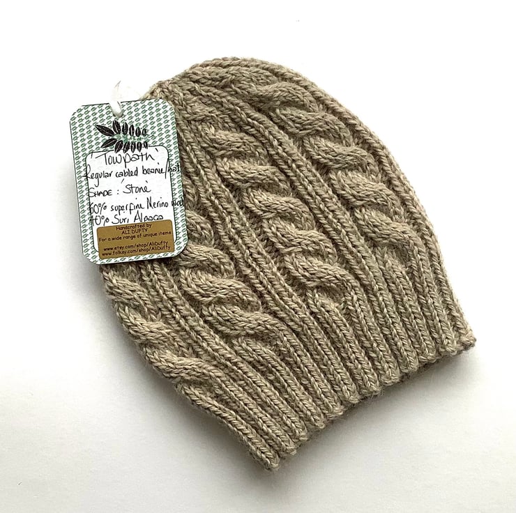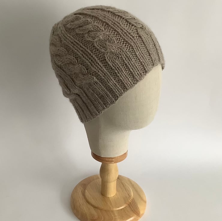 I have designed and knitted this regular beanie hat ' Towpath' in a classic cable pattern using a exquisitely soft and luxurious baby Alpaca / Merino wool blend yarn . Lightweight but super-cosy.
