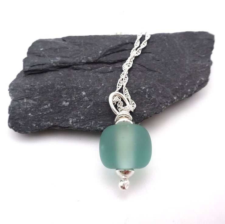 It features a handmade lampwork aqua glass pendant strung onto a sterling silver chain.