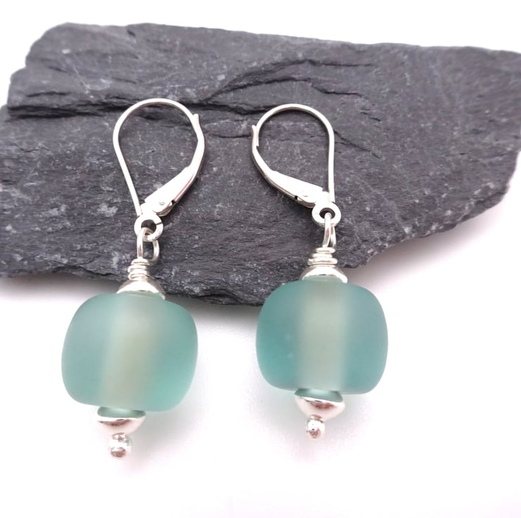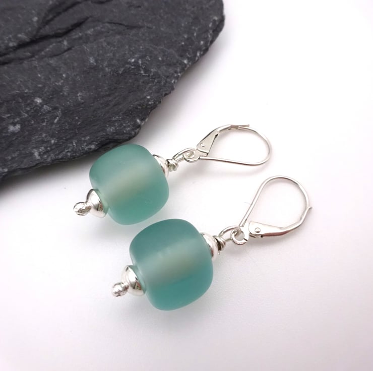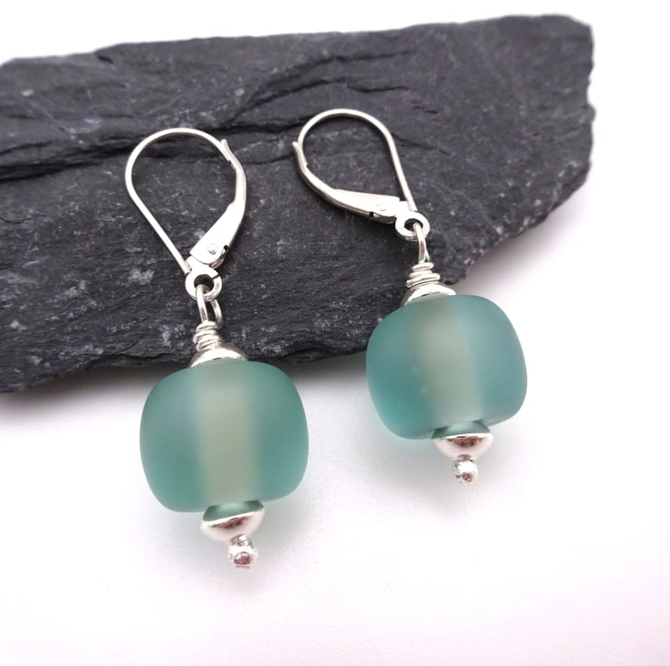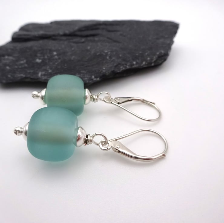 They feature handmade lampwork aqua glass beads strung onto sterling silver lever back ear wires.
