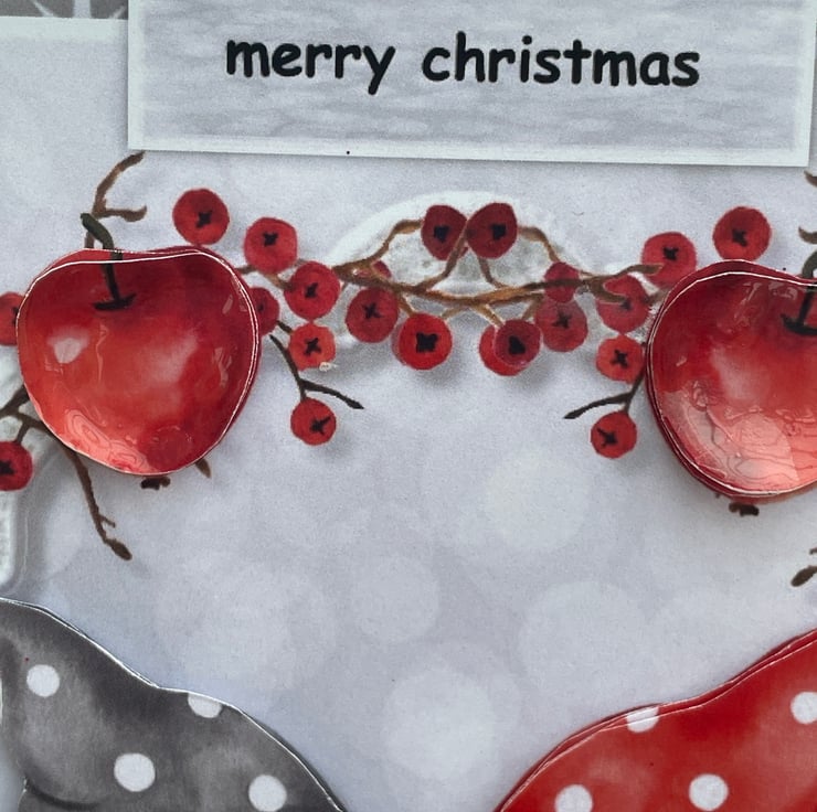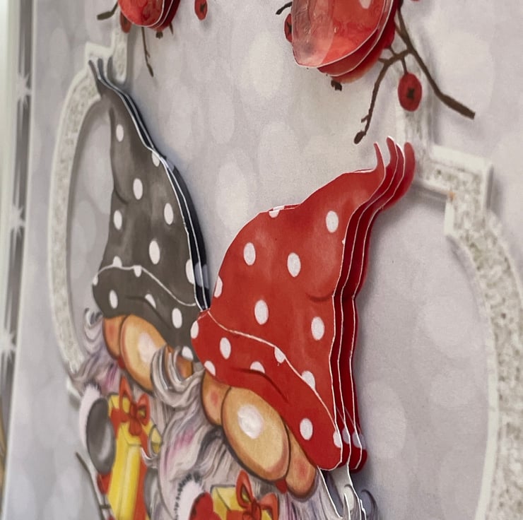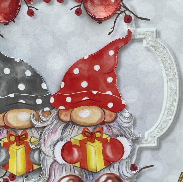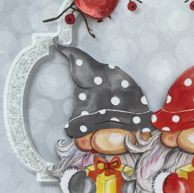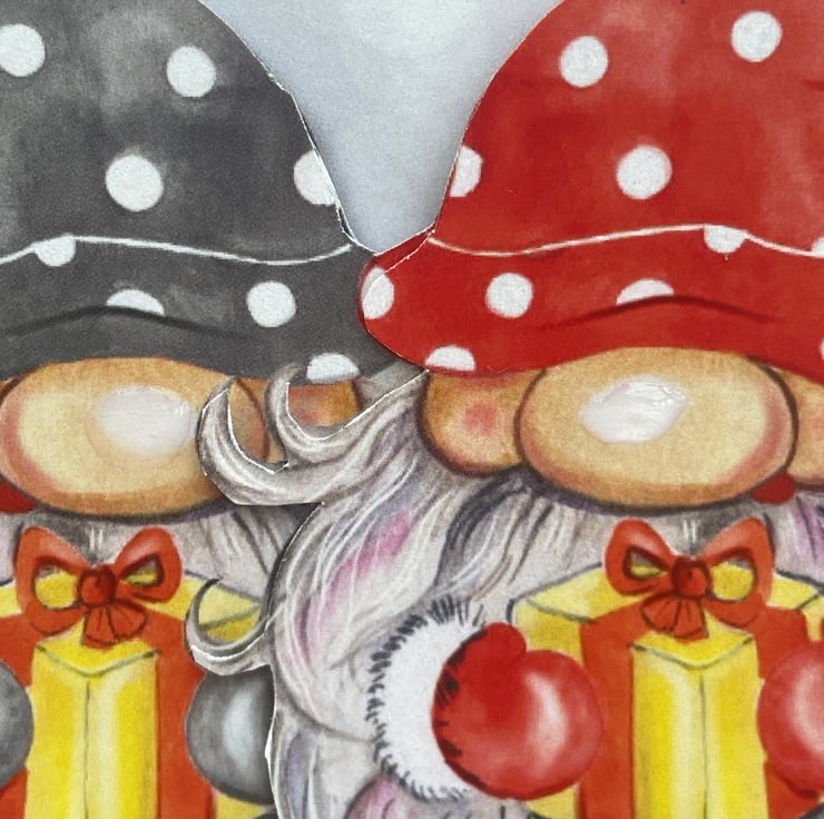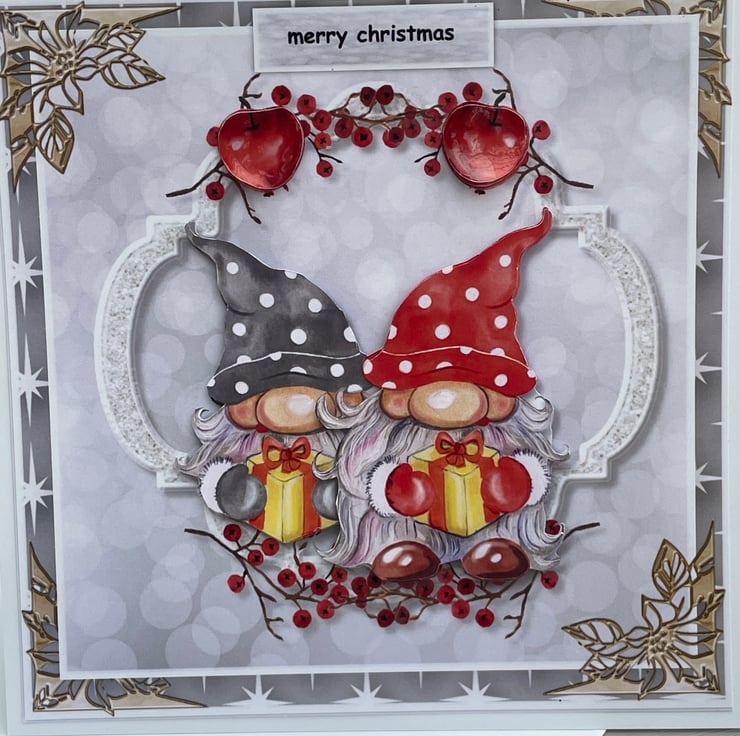 One for the gnome lovers this Christmas. This 20x20cm card features two jolly gnomes each holding a Christmas gift. They both have long hats, one red spotted and the other grey spotted. They are framed in branches covered in berries and apples. The greeting says Merry Christmas. Inside the card has a matching insert with the greeting Love, peace and joy. A beautiful sentiment for the festive season. A special card for a special person.