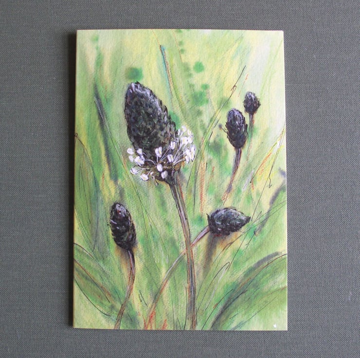 Blank greeting card. Original art work by Ann Robertson. Printed on high quality Tintoretto Gesso paper with a hammered finish. A6 width 10.5 cm height 14.8 cm. Side fold. Plain white envelope.