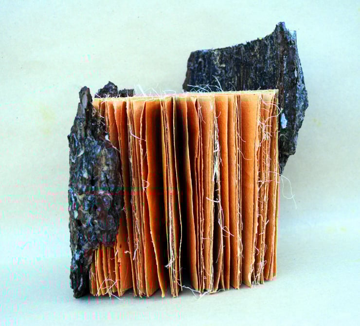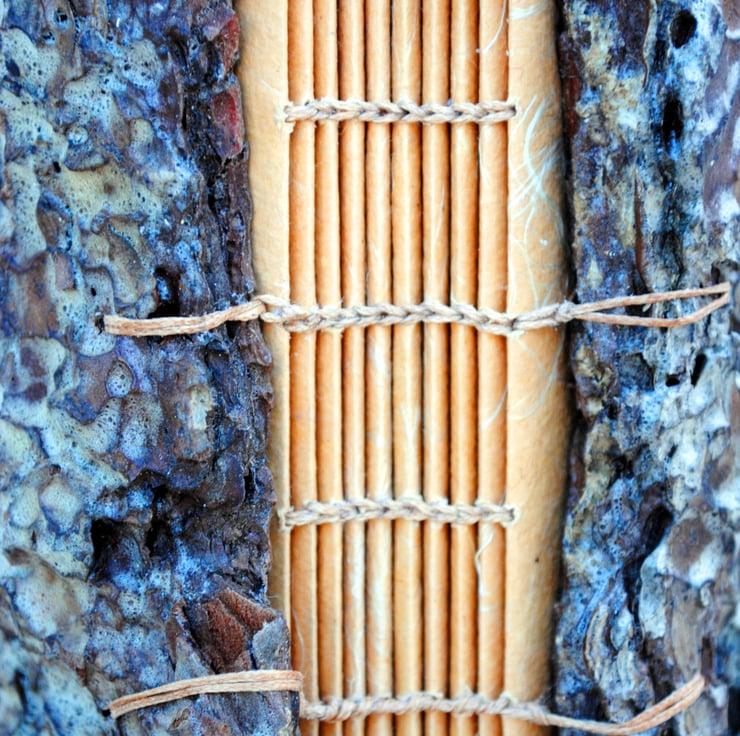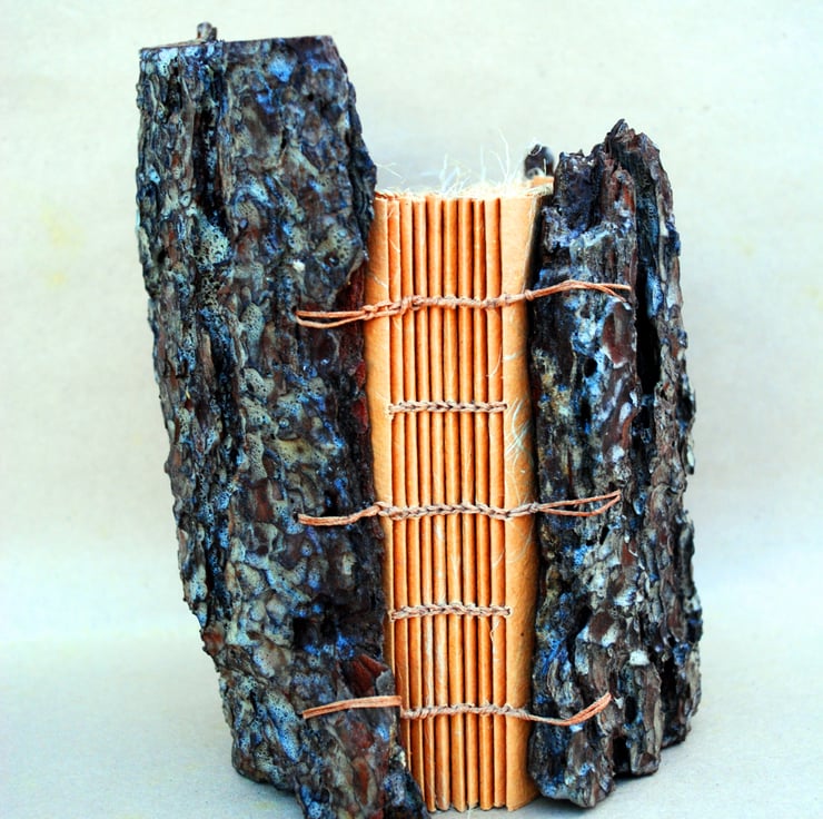 This hand bound journal was made by traditional methods, the paper was made and torn by hand and then stitched. The covers are made from Monterey Pine Bark, which has been strengthened and waterproofed and then waxed.