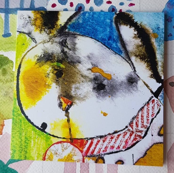 The original mixed media acrylic and collage piece was Inspired by ink blots that began to look like a dog! Dirty Dog