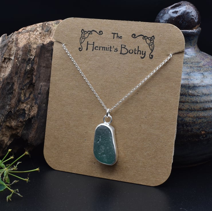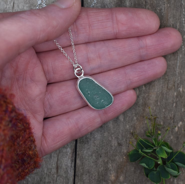 This necklace features a lovely piece of teal-green sea glass collected from a local Highland beach. The glass is set in a handmade bezel, made using 5mm fine silver bezel strip with a sterling silver back plate. It measures 2.6cm from the top of the bail. The sterling silver belcher chain has a bolt ring clasp and is 45cm (18 inches) long (see photo for how this looks).