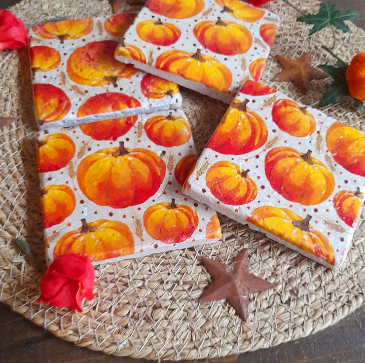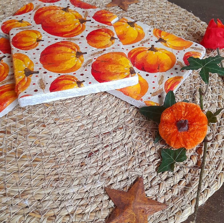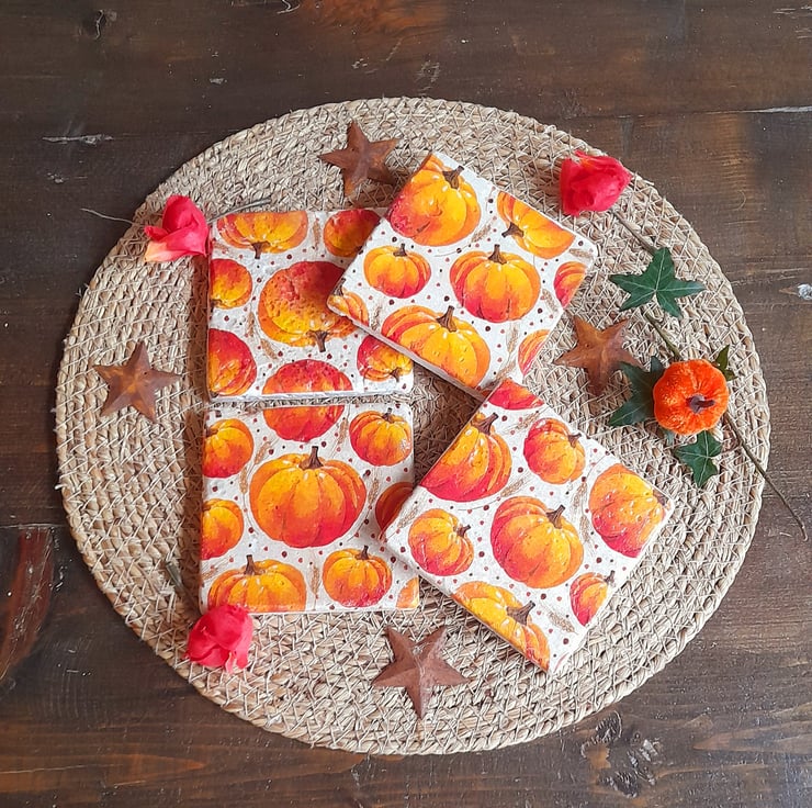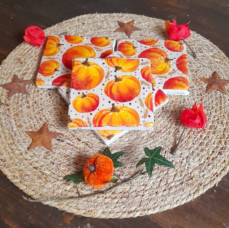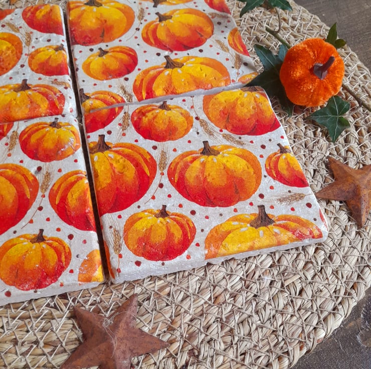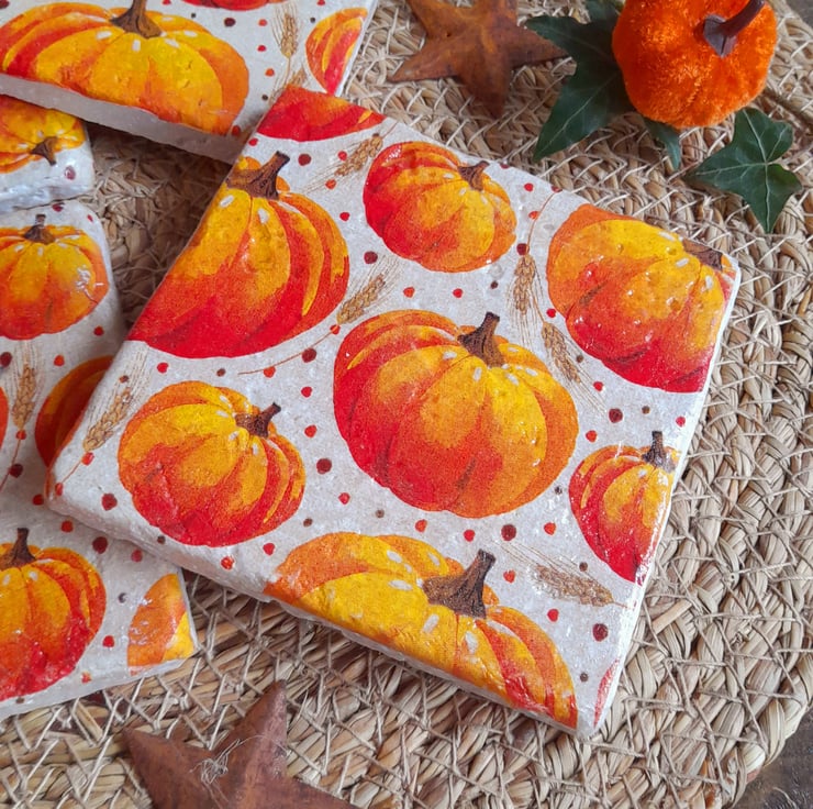 Set of 4 Natural Stone Coasters decoupaged with a lovely Autumnal Pumpkin scene.