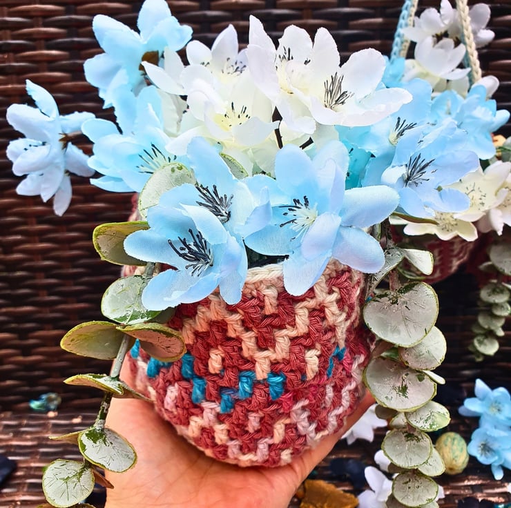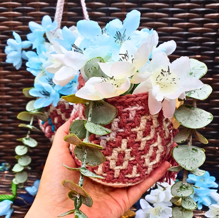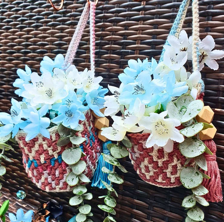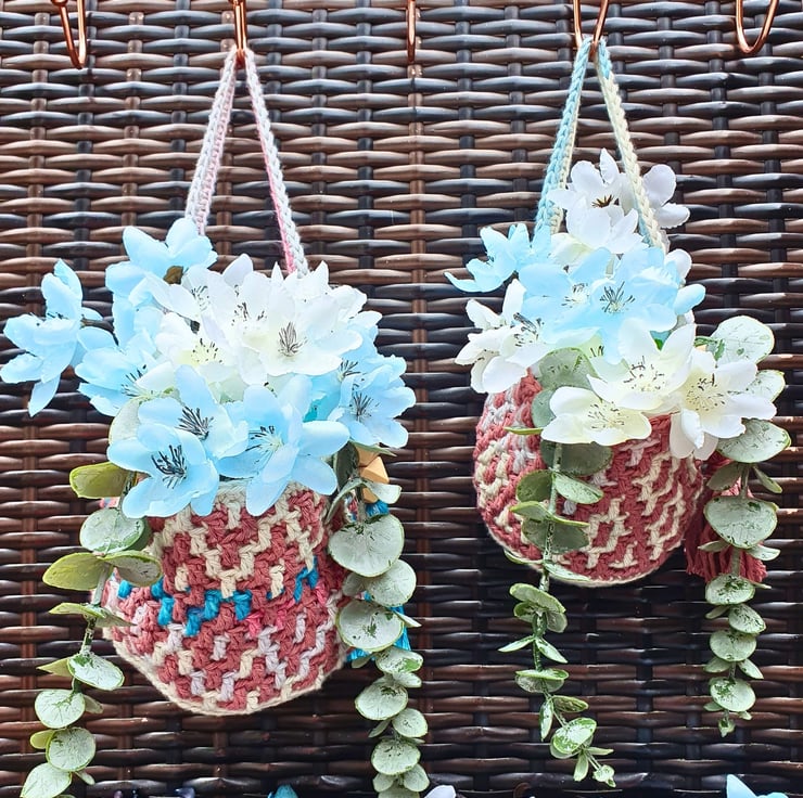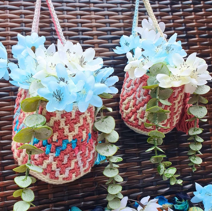 A set of 2 hanging baskets, handmade with the mosaic crochet technique. Perfect for hanging on your wall and fill with artificial flowers, air plants & small flower pots, on your peg board filled with your craft tools and various bits & bobs, or just place them on your furniture & decorative shelf & use them to store all your small items. A practical & modern idea for your interior decor, or as a housewarming gift.