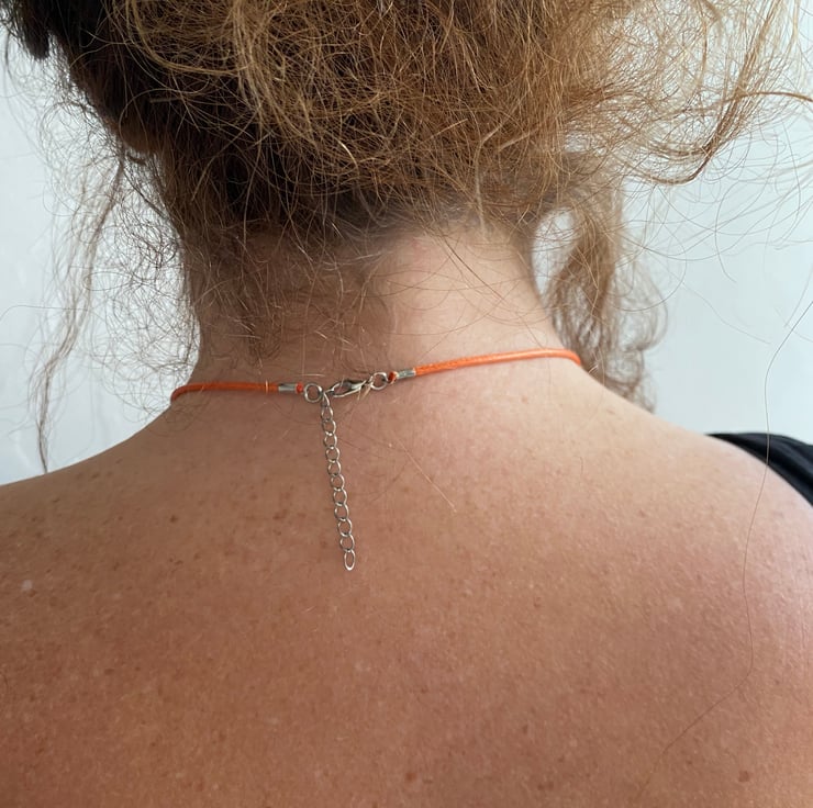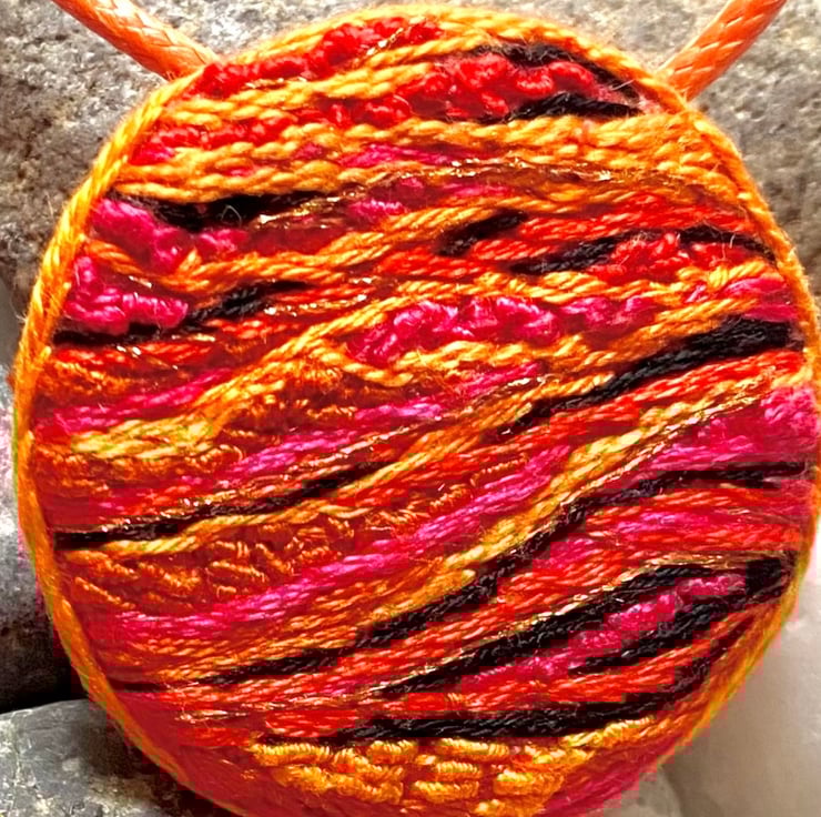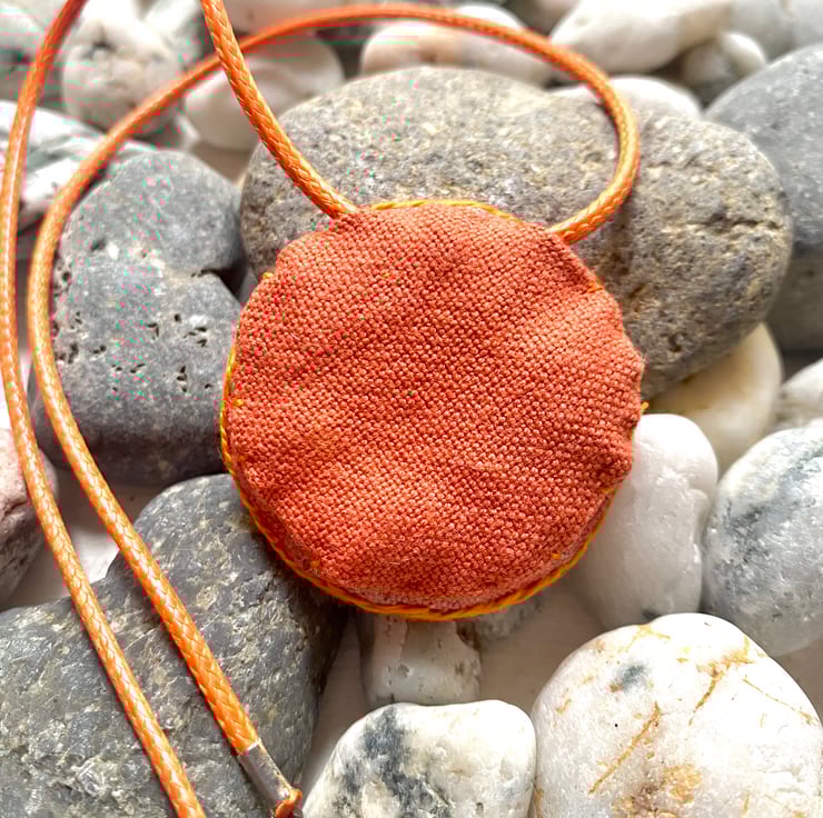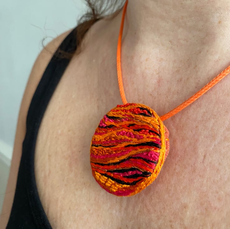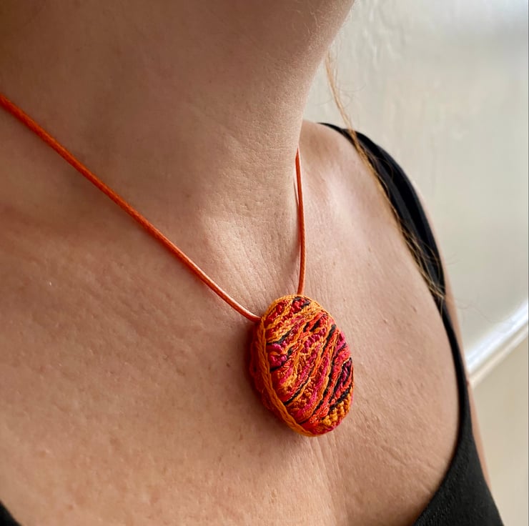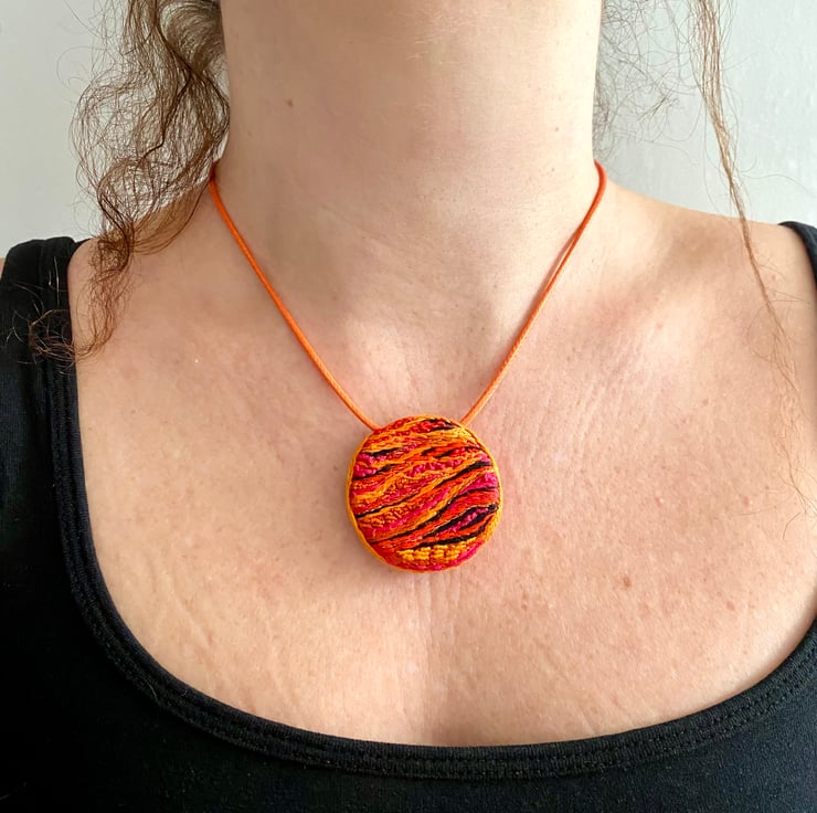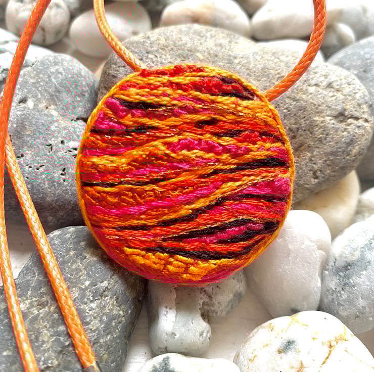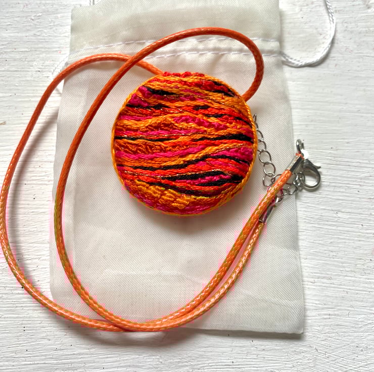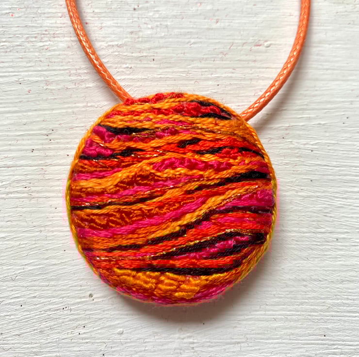 This vibrant abstract design has been hand stitched onto repurposed fabric. The fabric is stretched over a repurposed plastic disc and securely sewn in place. It floats just below the collar bone on an adjustable 17inch clasp fastening cord. The hot colours radiate a warm glow. This would make a bold addition to any wardrobe.