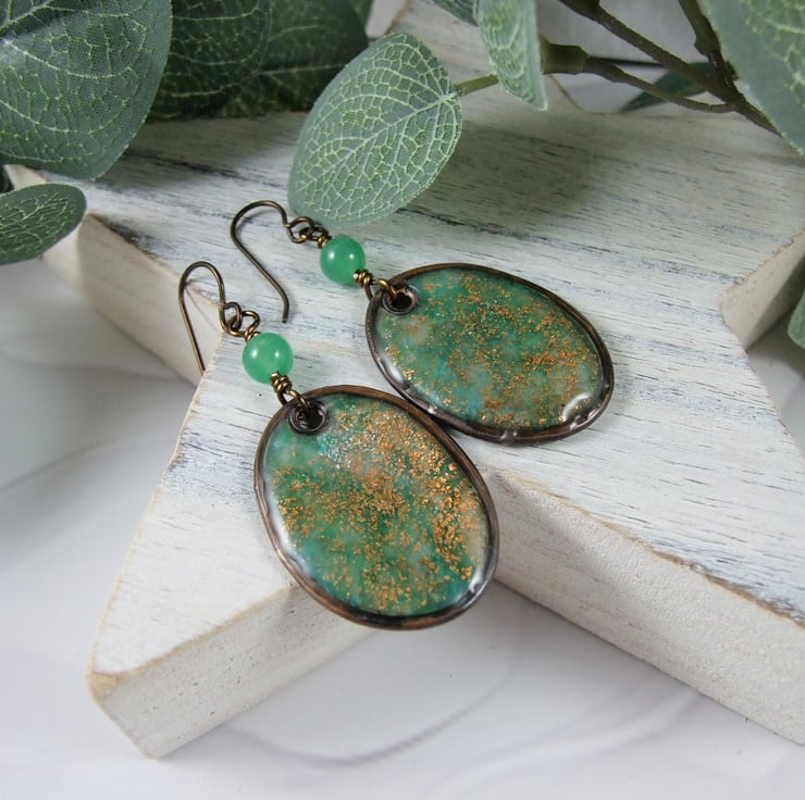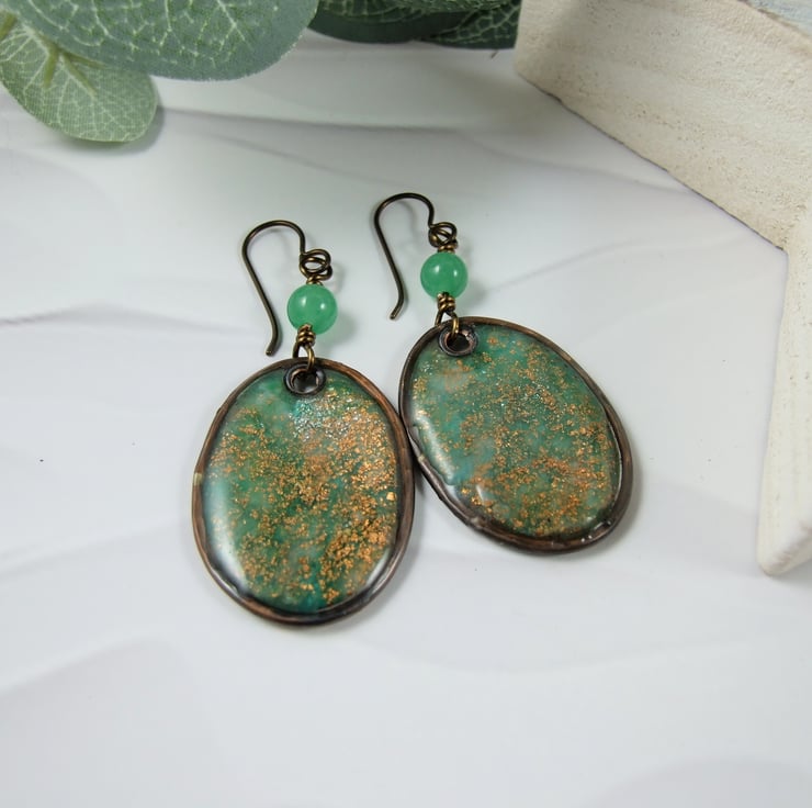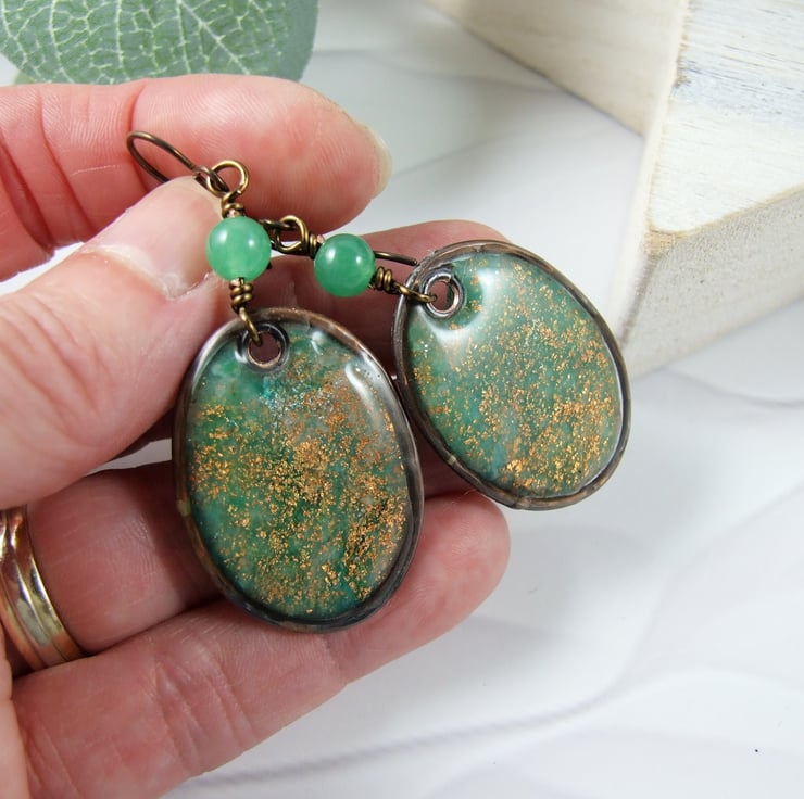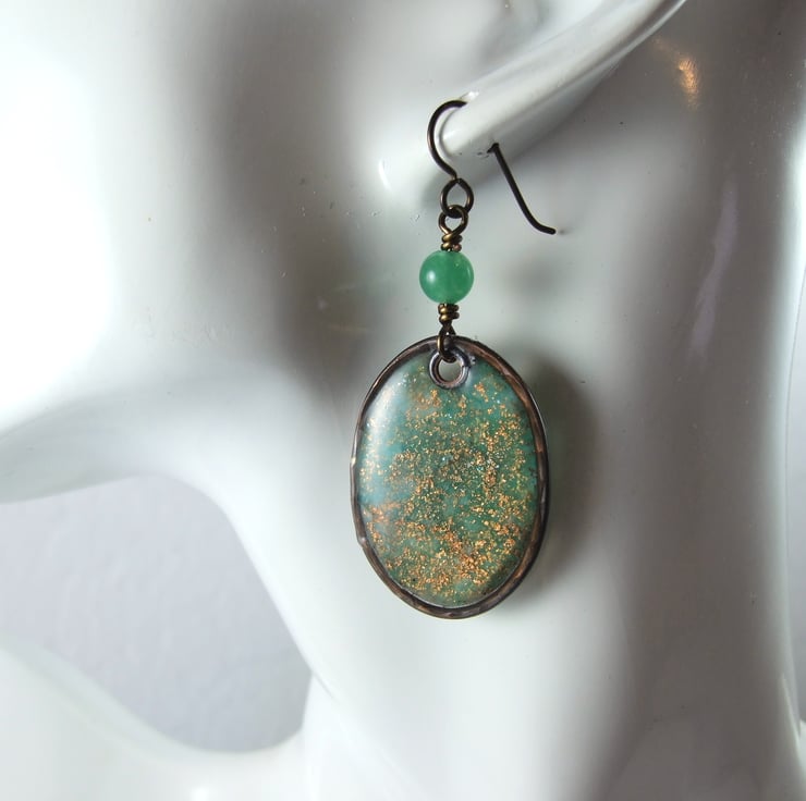 Copper Earrings with green marbled clay with metal leaf, niobium earwires and green jade gemstones. Perfectly Imperfect experimental piece. Many moons ago I worked a lot with polymer clay and recently found some clay in my stash so tried a new technique. I remembered why I stopped working with polymer clay, it takes a long time and it too messy, that metal leaf gets everywhere! These are an experimental one off design and will not be repeated so included in my sale and seconds section.