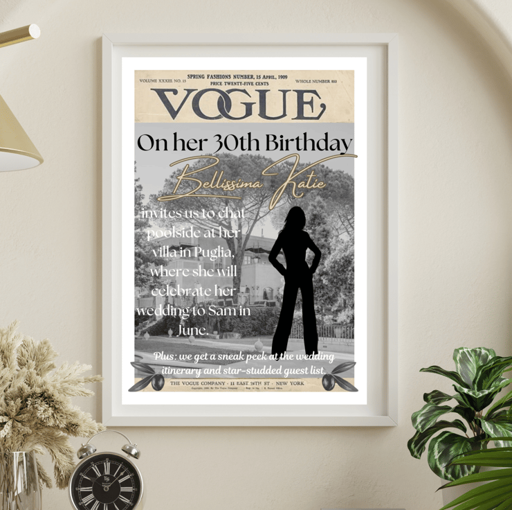 This listing is for a DIGITAL version of a Personalised Vogue Magazine Front Page Mock-up. The magazine cover is from genuine copy of a vintage Vogue magazine cover. Many different dates available. I will send you by email, 3 different mock-ups to choose from. Once you've decided I'll send the finished print to you as a pdf. You can then print this off at home.