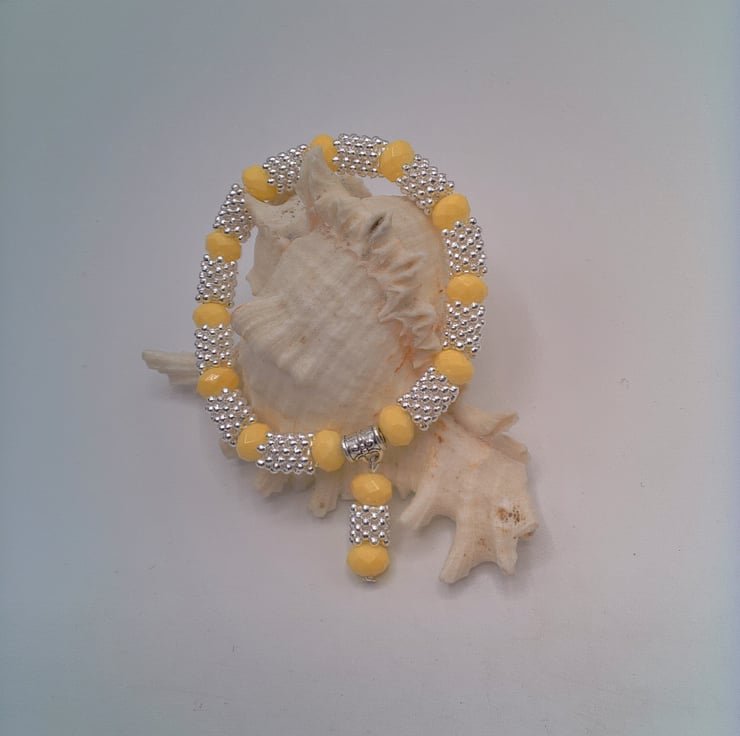 This pretty jewellery set comprises a necklace, bracelet and pair of earrings which is light and easy to wear. It would look great for a special day out or evening get together. The pendant is made using two 8 mm x 6 mm yellow faceted and six 6 mm silver plated snowflake spacer beads suspended on an 18 inch silver plated chain fastened with a silver plated lobster clasp. The bracelet uses the yellow faceted beads and silver plated snowflake spacer beads threaded onto jeweller's elastic. The earrings use the same beads used for the pendant and they are suspended on silver plated lever backs. The necklace is 18 inches (46 cm) in length, the bracelet is 7 inches (17.25 cm) in diameter and the earrings have a drop of 0.75 inch (2 cm) from the base of the ear wire. The jewellery set will be dispatched wrapped in tissue paper in an organza bag and be delivered via Royal Mail first class post. The set would make a lovely gift for a jewellery loving lady.