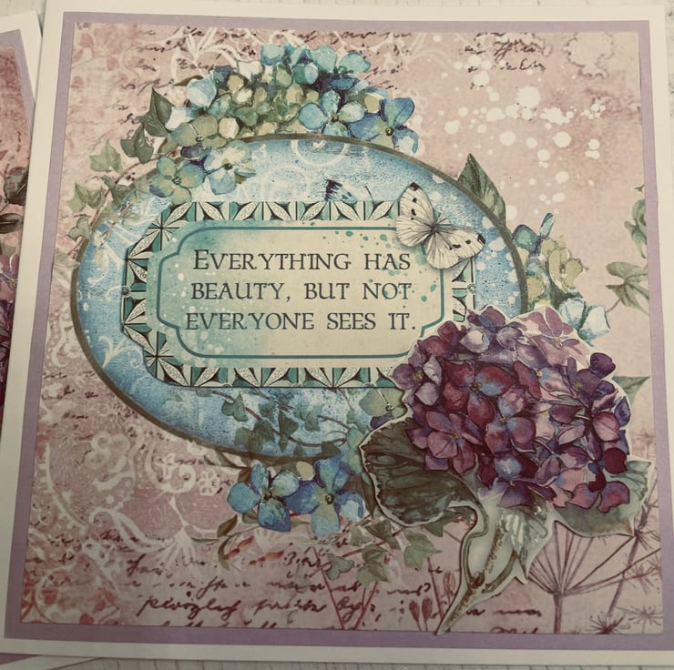 A set of 2 beautiful hydrangea greeting cards, both left blank for your own message. Main topper mounted onto lilac card. Decorated with a fussy cut and a word plate, reading either ‘Everything has beauty, but not everyone sees it’ or ‘Flowers don’t tell they show ’, suitable for most occasions handy set of 5.75” cards to have to hand.
