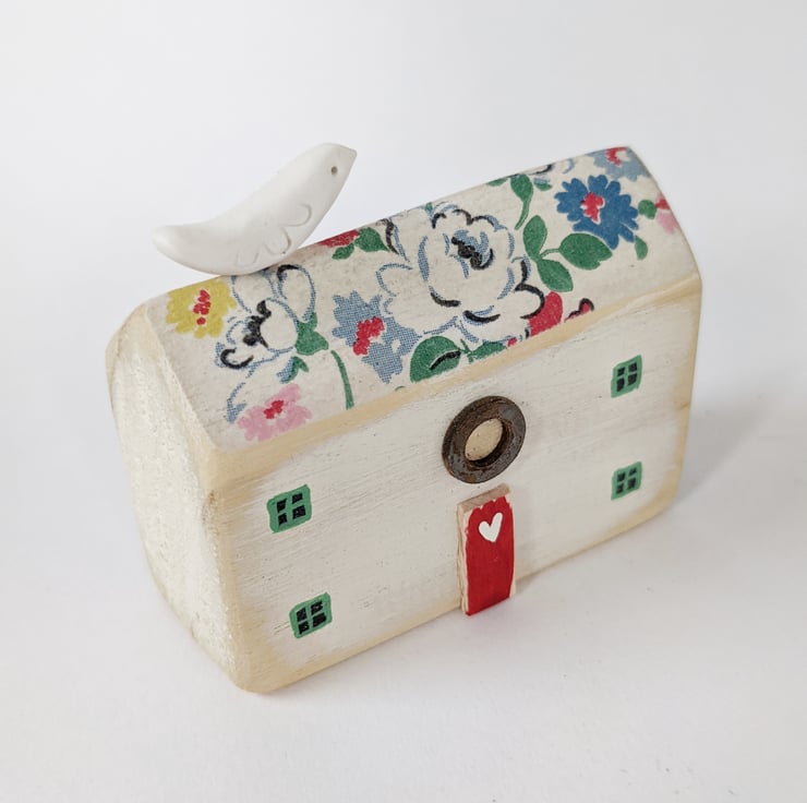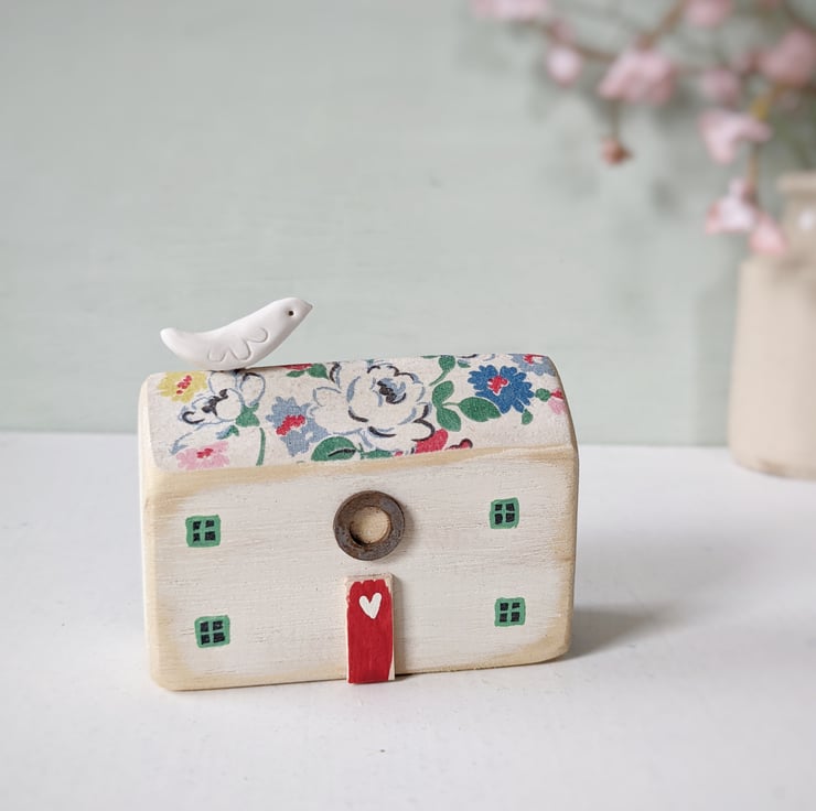 The roof is adorned with floral decoupage, and the tiny door and windows are hand painted.