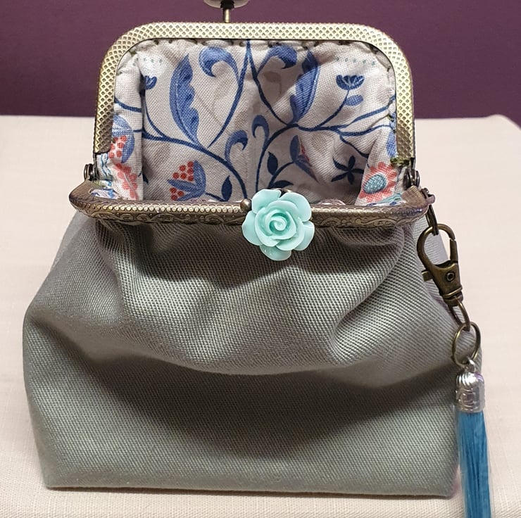 Purse has a silver look kiss lock frame with unusual rose clasp.