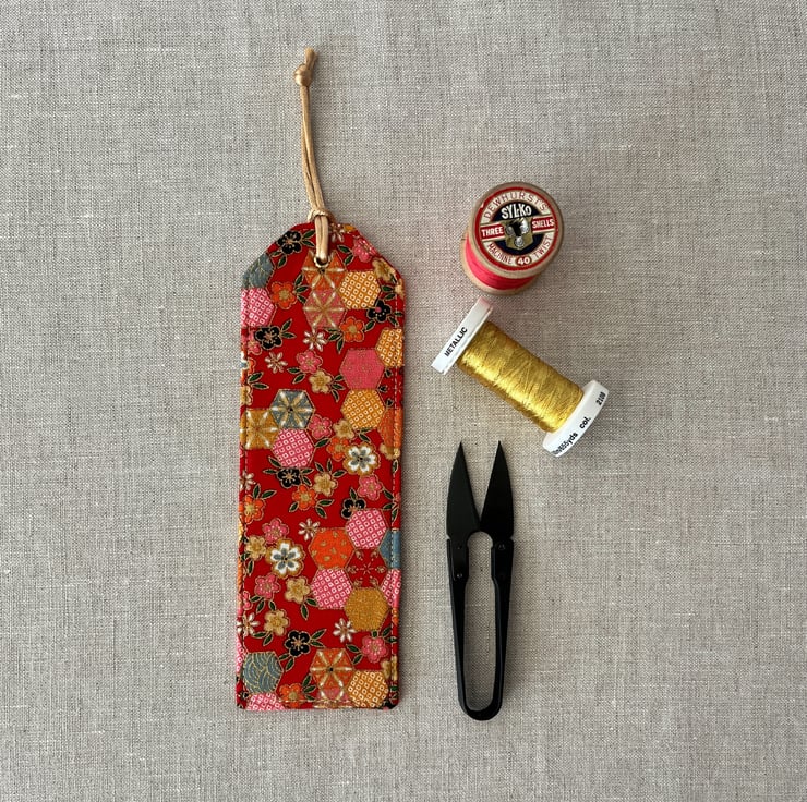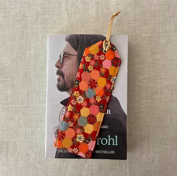 This bookmark has been handcrafted from vibrant Japanese fabric. It depicts hexagons with traditional Japanese patterns and small blossoms with leaves outlined in gold on a red background.