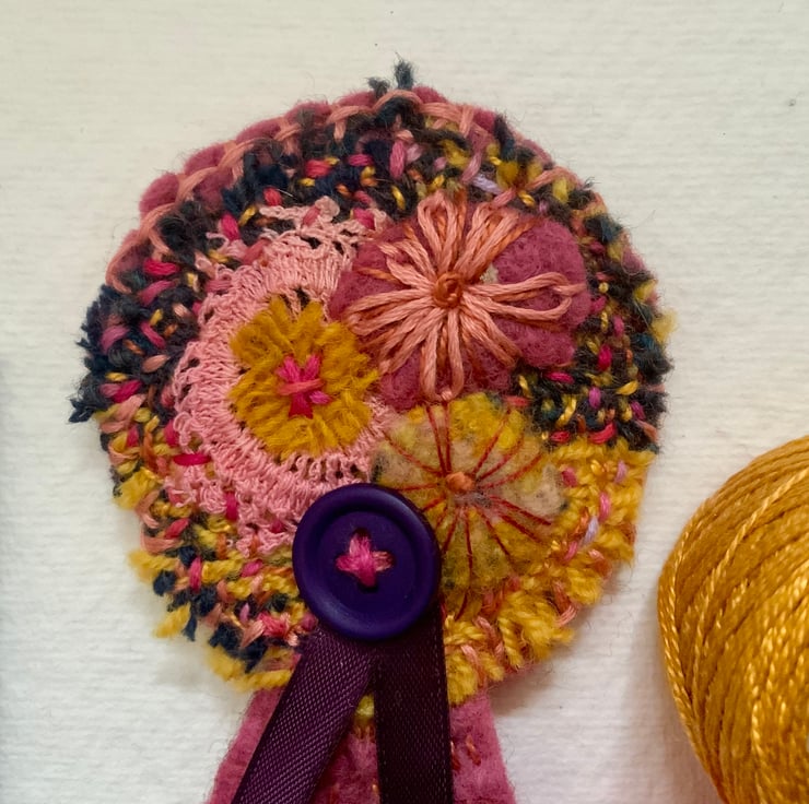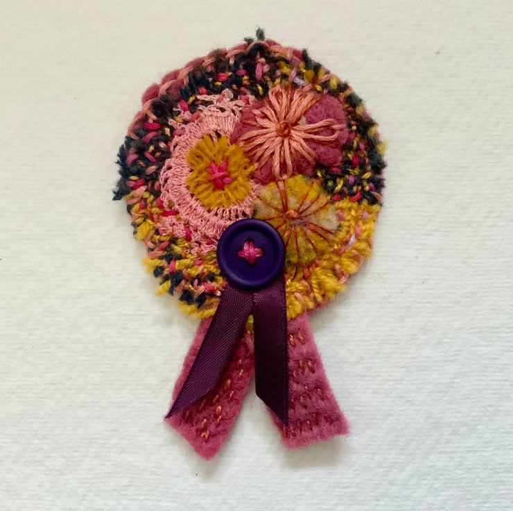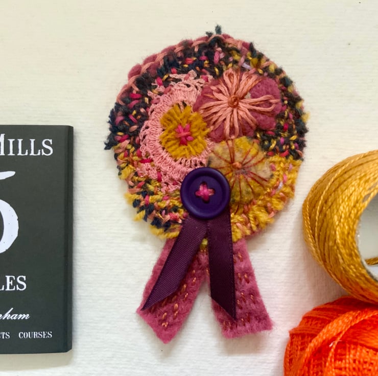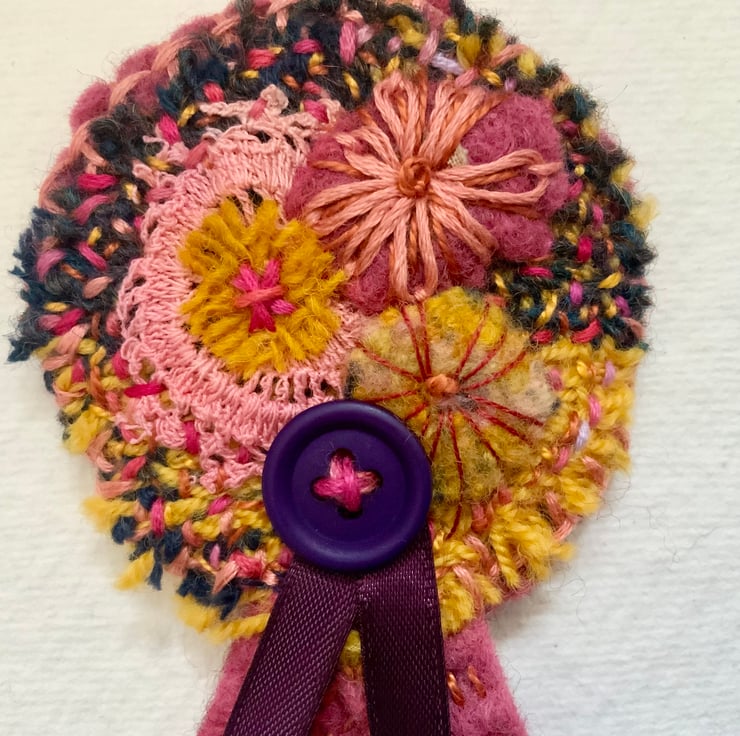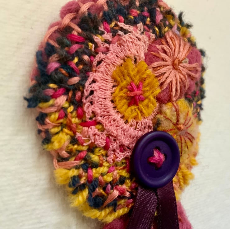 This is a hand made textile brooch which I have made with some of my hand woven cloth, commercial felt and recycled fabric. I’ve embellished the brooch with lots hand embroidery and a button. It measures 3.5 x 2.5 inches and is finished with a silver plated brooch back. It is a lovely brooch to add a bit of quirkiness to a coat, jumper or tote bag, or to give as a gift.