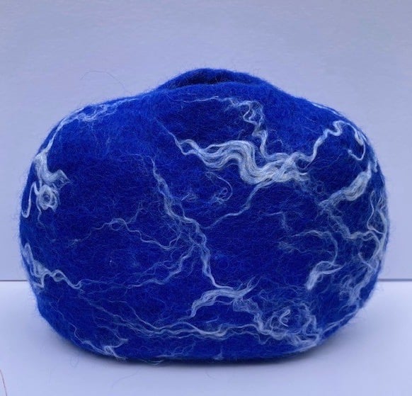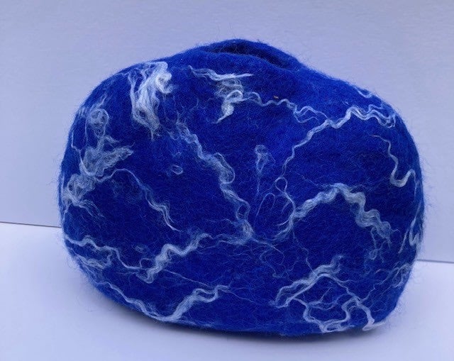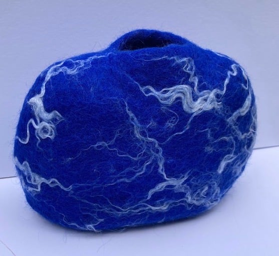 This wool, felted vase has been created using the wet felting process, which entails rubbing and rolling wool with water and soap and then shaping it. This creates a unique, one-off shape. I have used prussian blue merino wool and white sari silk to create the illusion of clouds in the sky.