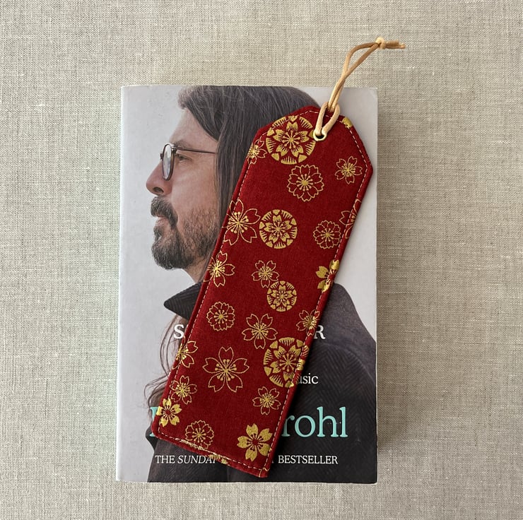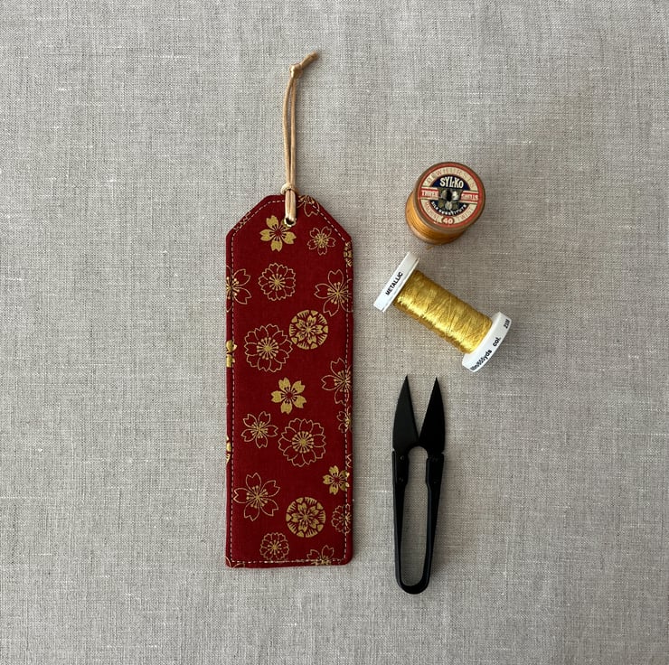 Handcrafted from vibrant Japanese fabric, this bookmark depicts a variety of flowers, including cherry blossoms in gold gilding on a deep red background. It would make a lovely gift for someone and can easily be sent with a card.
