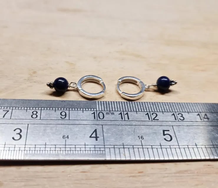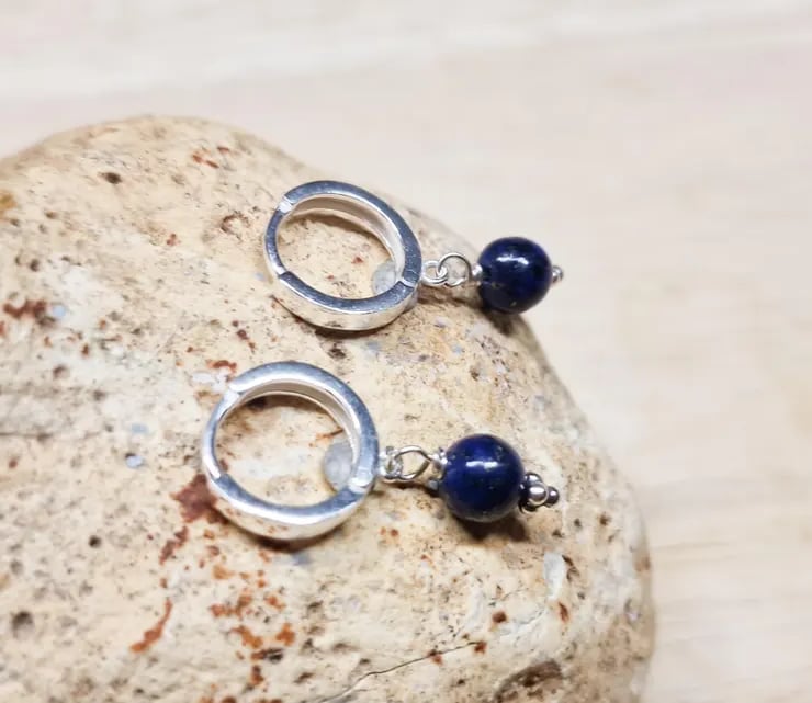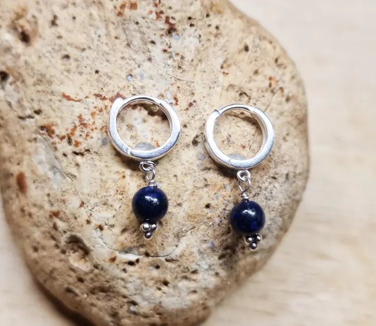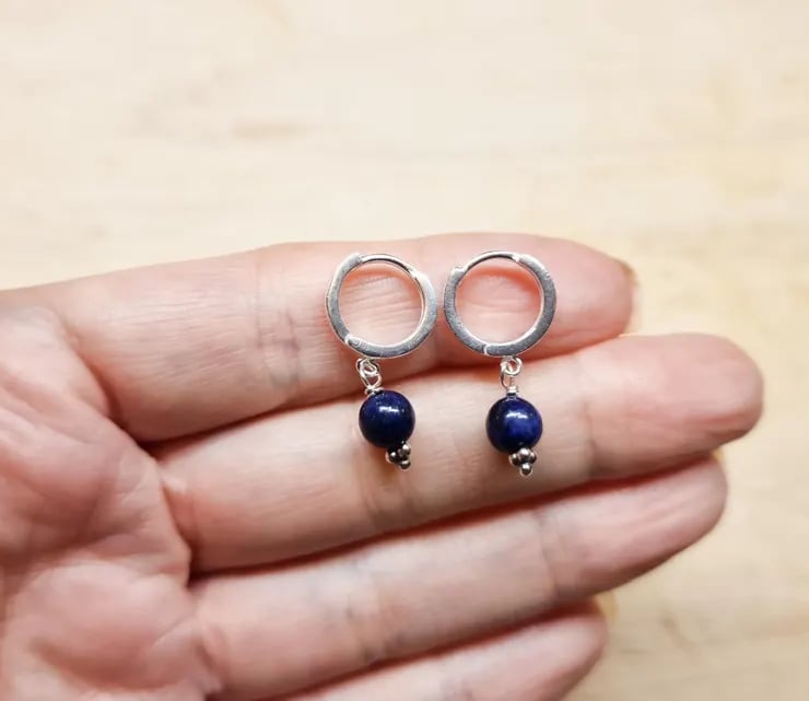 These are sterling silver lapis lazuli huggie style hoop earrings.