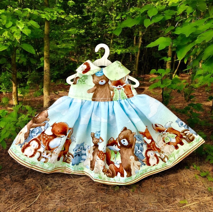 A really cute little dress in a forest friends print, to fit the Mulberry Green characters. The dress is made from best quality cotton and has a Peter Pan collar and a lined bodice.