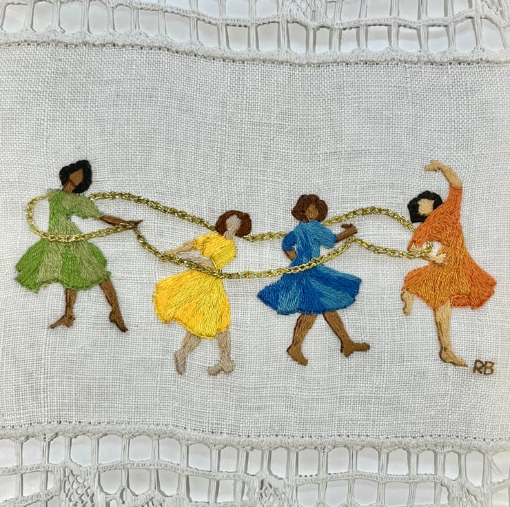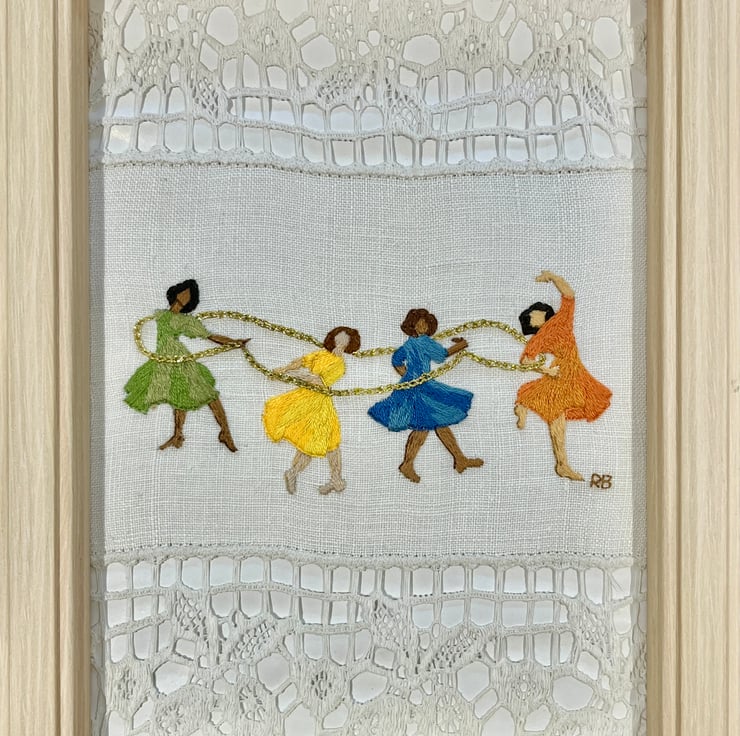 My embroidered art explores the intersection of nature, heritage and culture. I draw inspiration from folklore, the natural world and personal experiences to create works that are both evocative and deeply symbolic. By meticulously hand stitching onto inherited and reclaimed fabrics, I breathe new life into materials steeped in history and memory. My pieces explore themes of the interconnectedness of nature, resilience, and the complexities of the human experience.