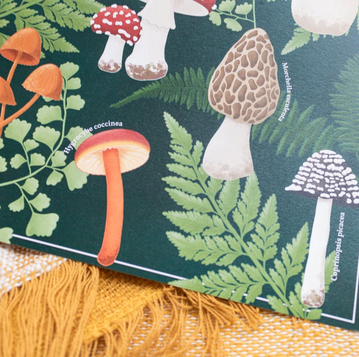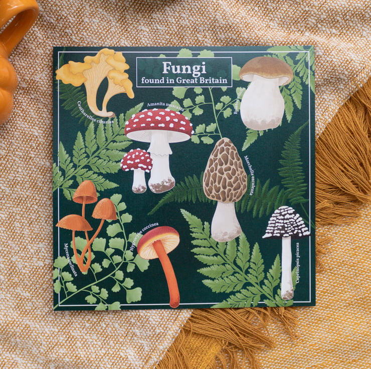 The square Mushroom Print features 7 different mushrooms found in Great Britain: Fly Agaric, Chanterelle, Morel, Penny Bun, Clustered Bonnet, Magpie Inkcap and Scarlet Waxcap.