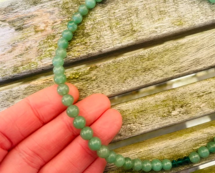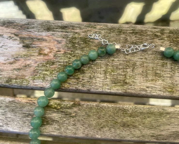 A pretty shade of green aventurine gemstone, 4mm in size, with green Swarovski crystals choker necklace, measures 14inches plus a two inch sterling silver hearts extension chain so can be worn up to 16 inches. last one left. Free gift pouch.