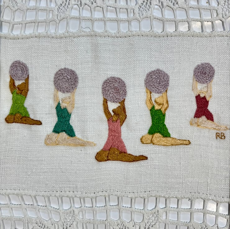 My embroidered art explores the intersection of nature, heritage and culture. I draw inspiration from folklore, the natural world and personal experiences to create works that are both evocative and deeply symbolic. By meticulously hand stitching onto inherited and reclaimed fabrics, I breathe new life into materials steeped in history and memory. My pieces explore themes of the interconnectedness of nature, resilience, and the complexities of the human experience.