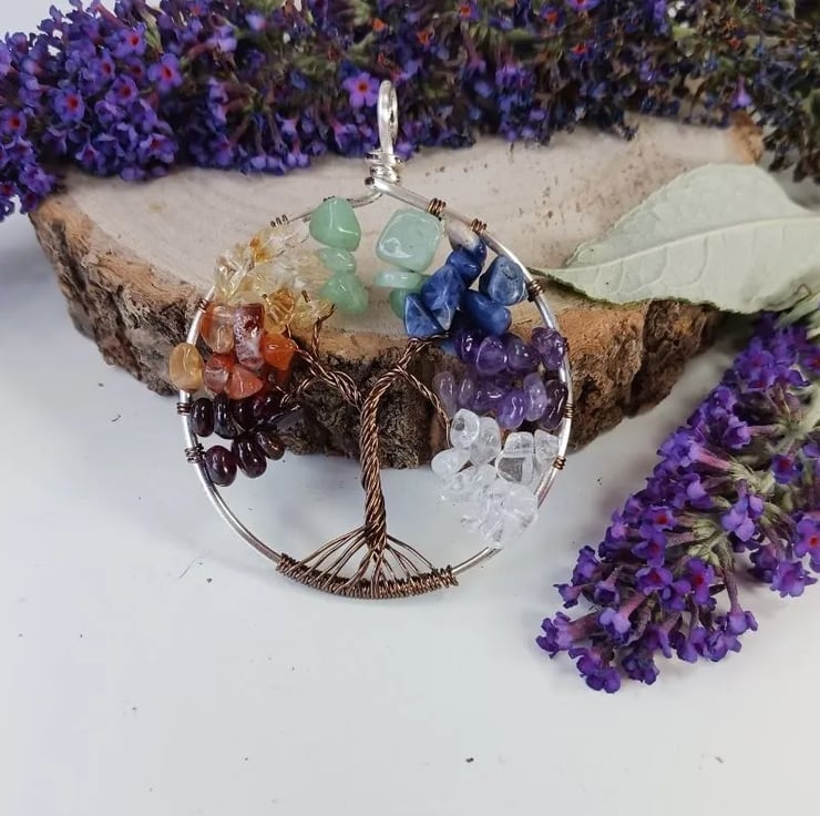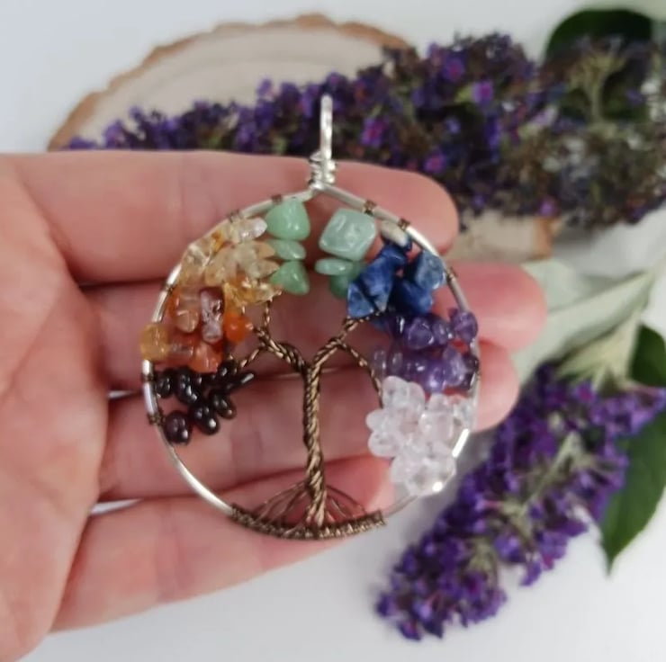 A stunning chakra tree of life necklace made with garnet, carnelian, citrine, green aventurine, sodalite, amethyst, and clear quartz. These necklaces measure approximately 2" and comes on a 20" chain.