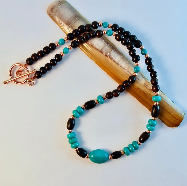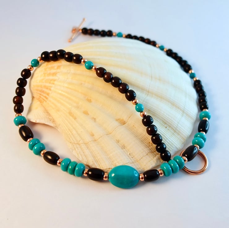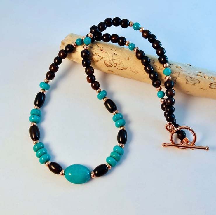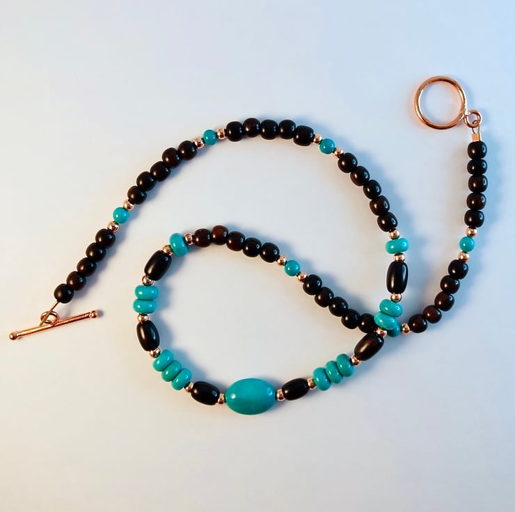 The centrepiece of this stylish necklace features dark brown Tiger Ebony wood 5x8mm rice beads, set with a 10x14mm Hubei Province Turquoise oval and twelve 6mm Hubei Province Turquoise rondelles, all highlighted with 3mm pure copper beads.