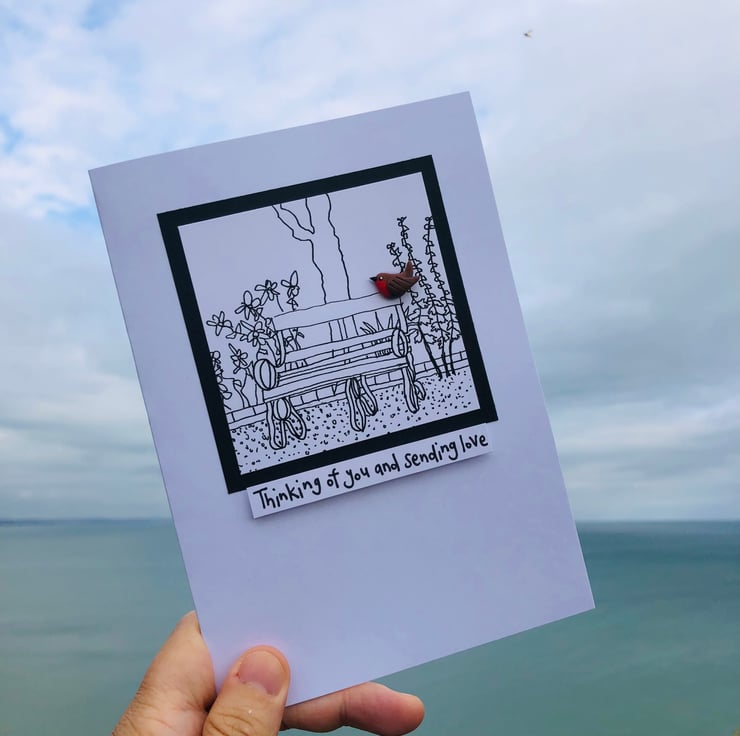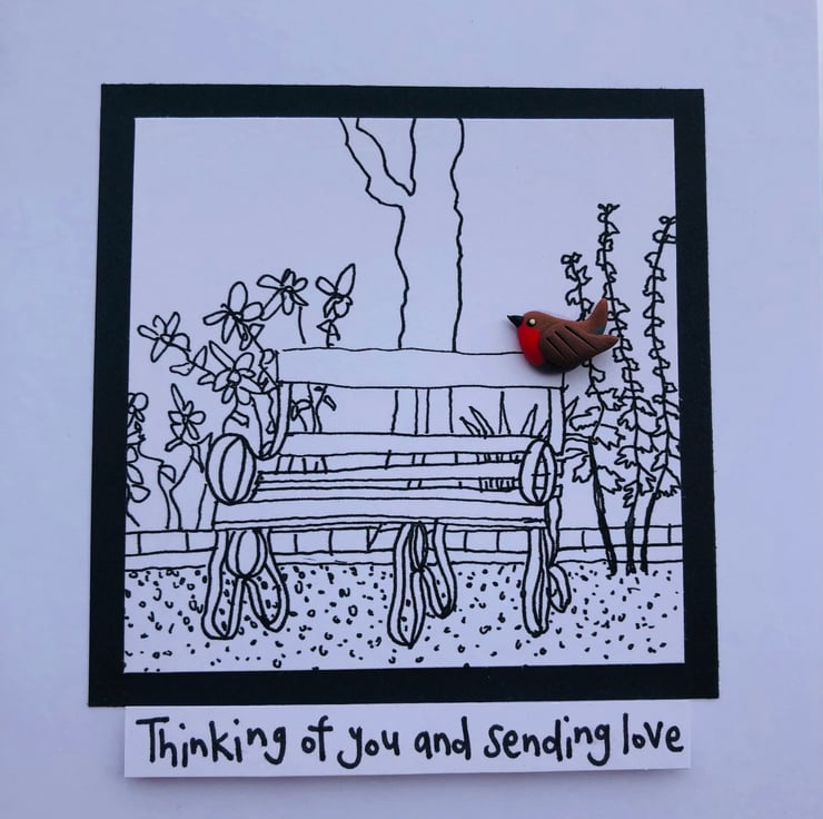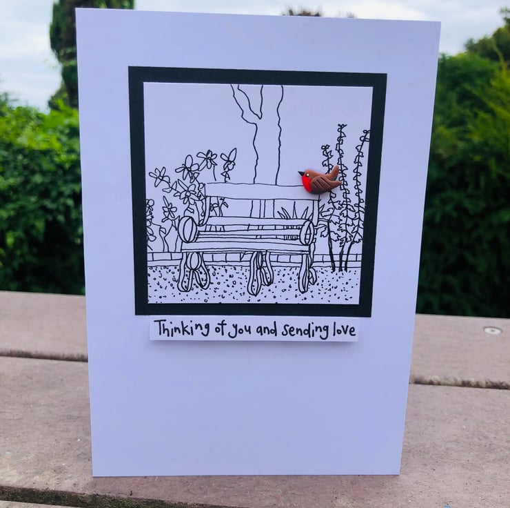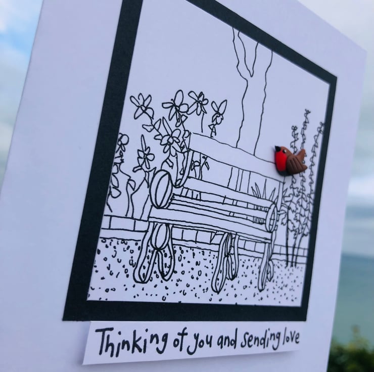 Inspired by walks in the countryside, this print/polymer clay mix card is a striking combination and a stand out on the shelf of cards with its handmade design. It is perfect card for those going through difficult days as it carries an element of reflection, with the robin a ray of hope in a colourless view.