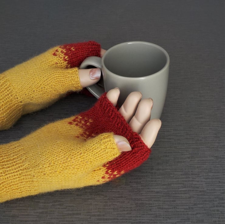 Red and yellow gloves - I have hand-knit these lovely fingerless gloves using pure British wool, from Exmoor Horn breed of sheep. The design is a simple Fairisle changeover pattern from yellow at the cuff to red at the fingers. They have a long cuff to slip under your coat to keep the draughts out, and a fully shaped thumb. The gloves end in a band of rib, leaving your fingertips clear to use your phone or doorkey easily.