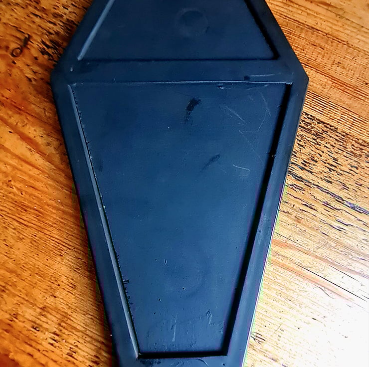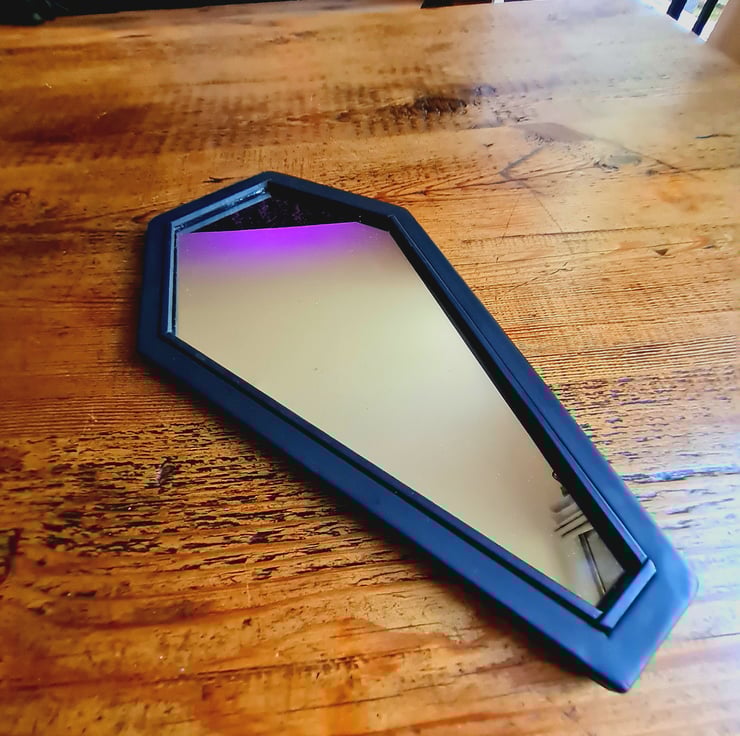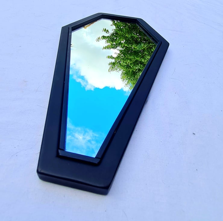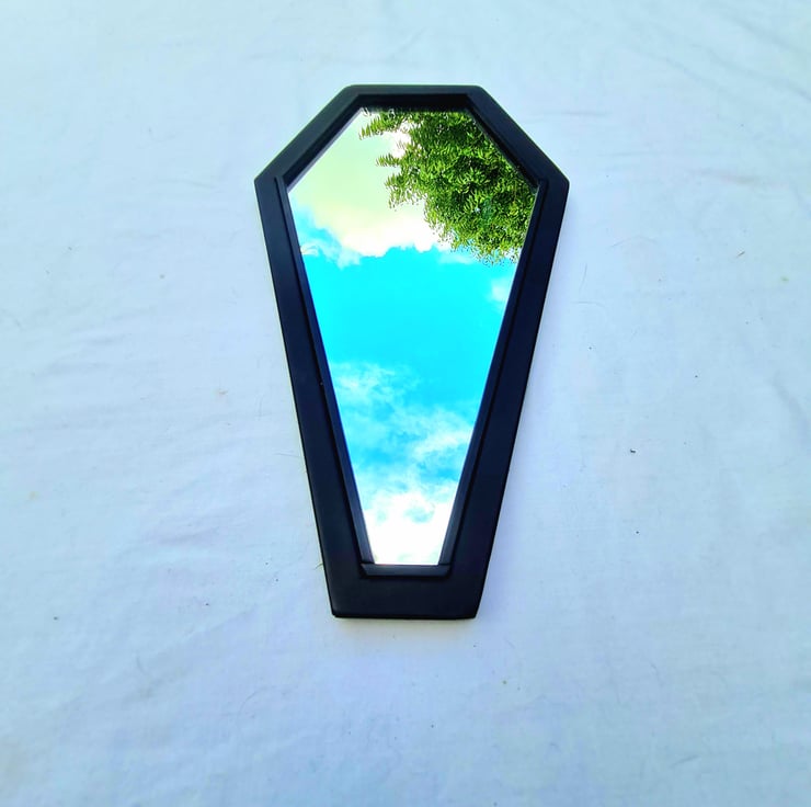 Im Selling a hand crafted coffin shaped mirror Ive made from upcycled steel and wood.