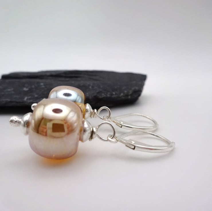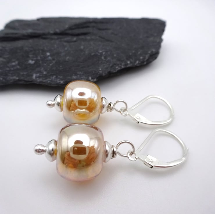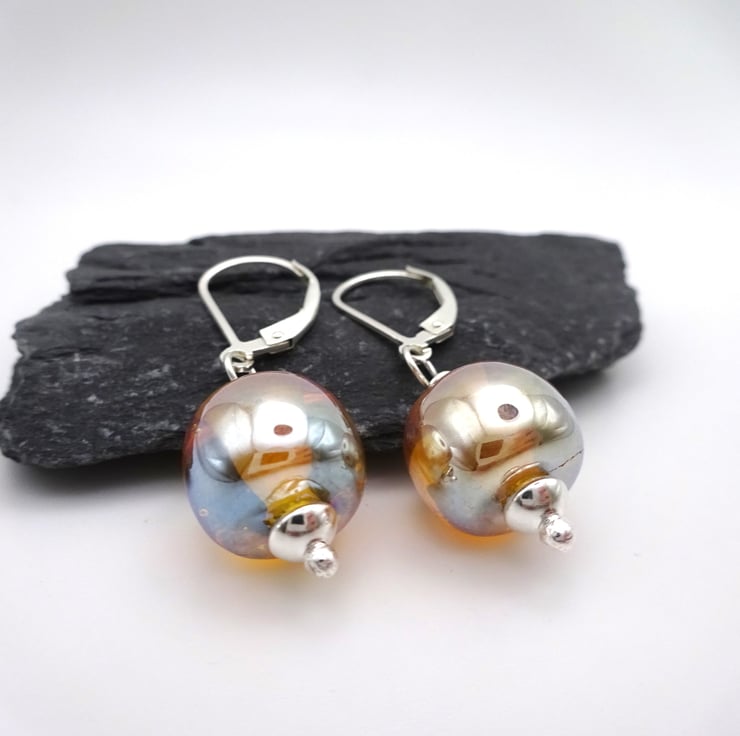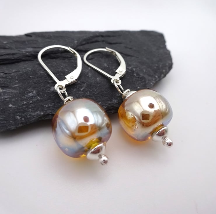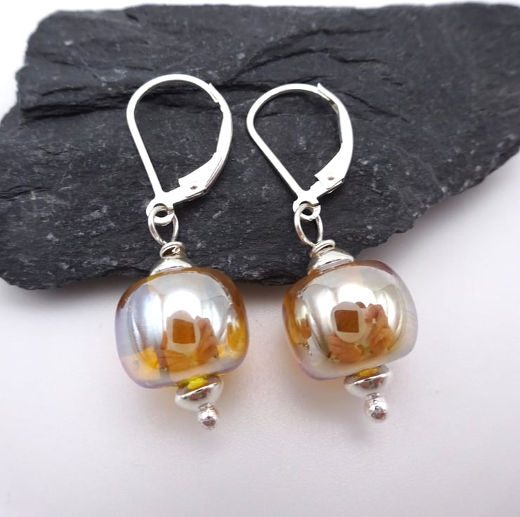 They feature handmade lampwork gold glass beads strung onto sterling silver lever back ear wires.