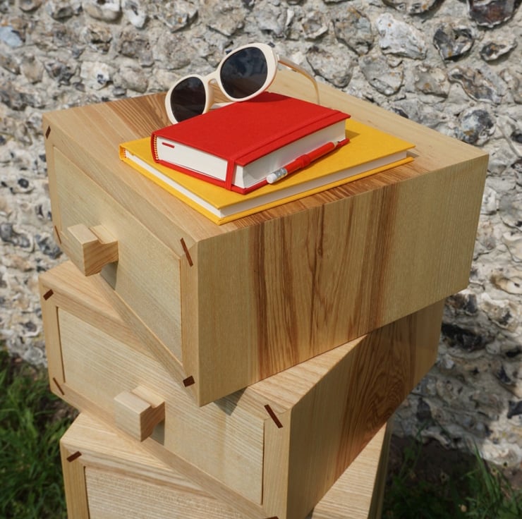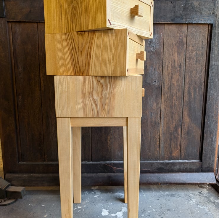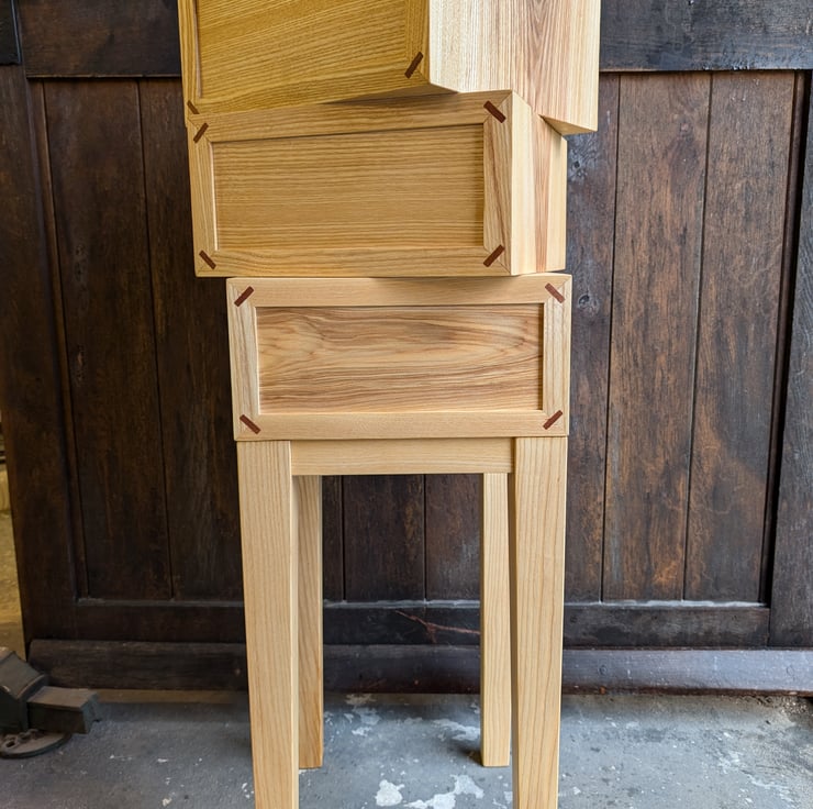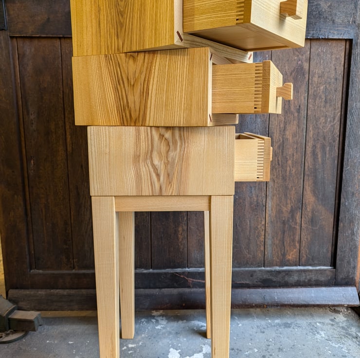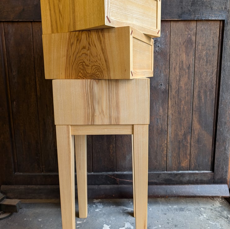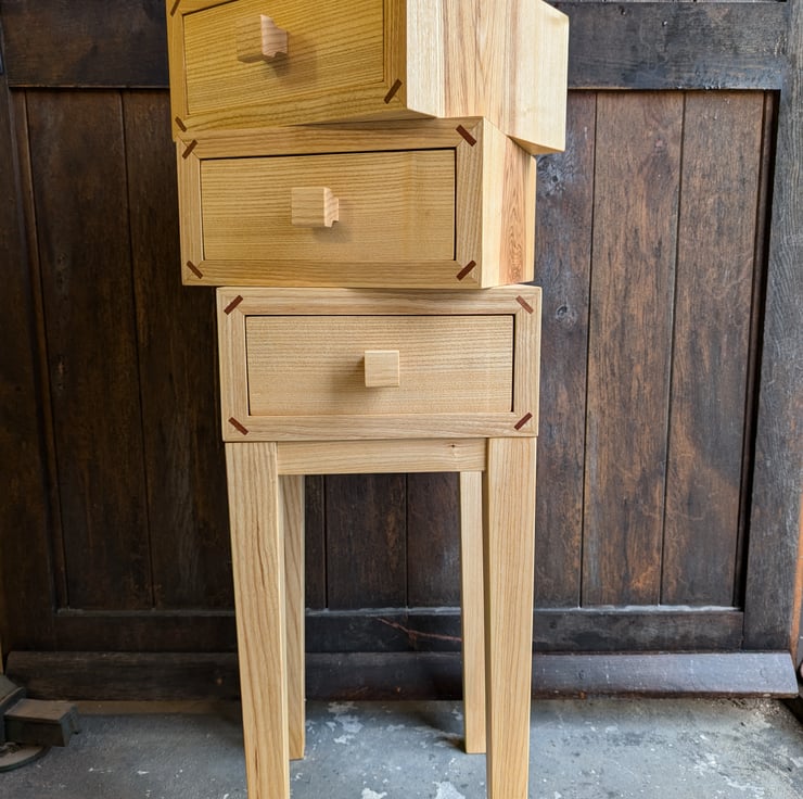 A twist on a three tier set of drawers made from solid English Ash with Sapele plugs made by hand by me on the South downs.