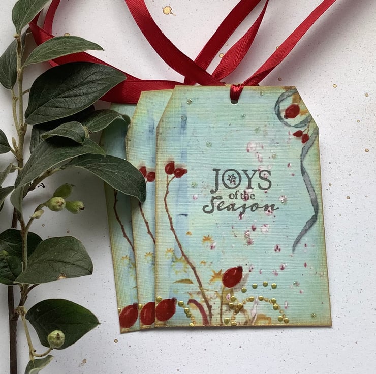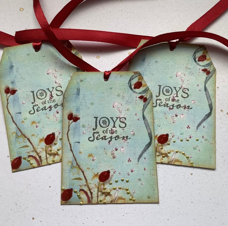 Printed on quality linen-look cardstock ( 285gsm ) .The edges are inked and 'aged and the image embellished with glitter , and I have stamped 'Joys of the Season' on them too. The tags are then finished with pretty, silky ribbon.