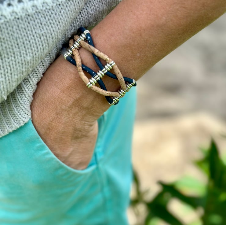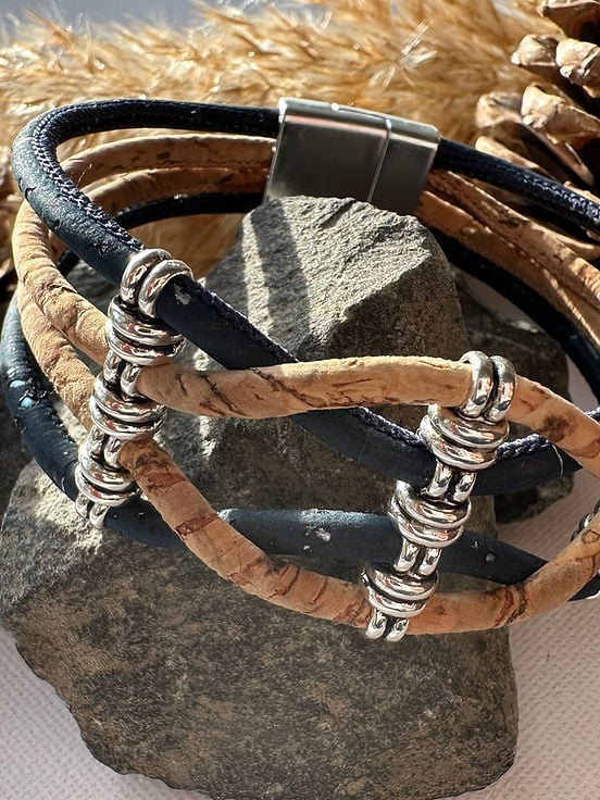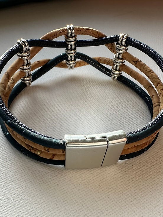 An unusual but elegant lightweight bracelet, made from natural Portuguese cork 'leather' (completely Vegan) and antique silver effect bars creating a stunning bracelet that can be worn casually on holiday or works equally well with a dressier outfit.