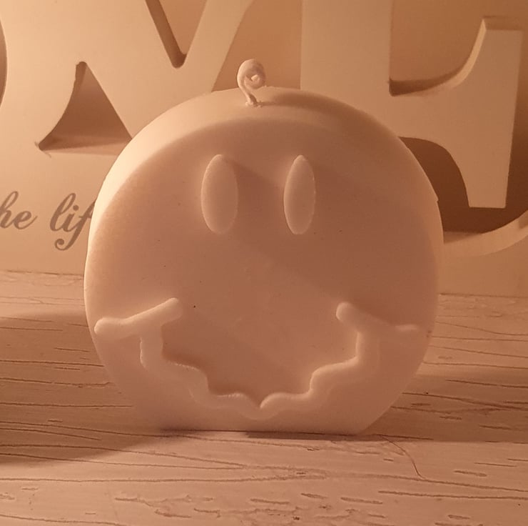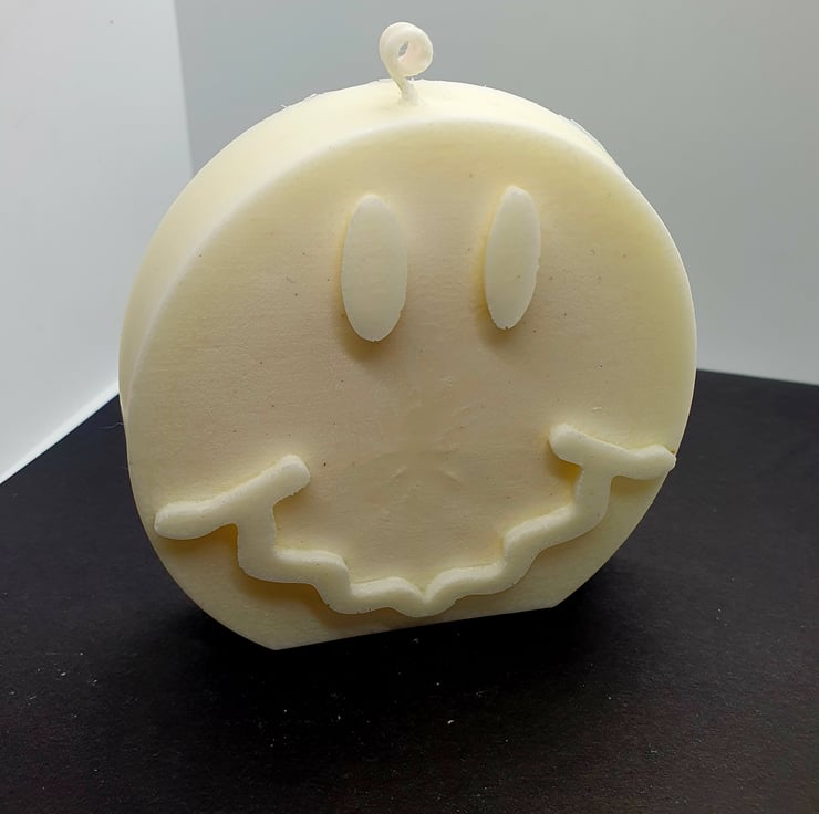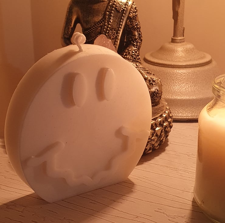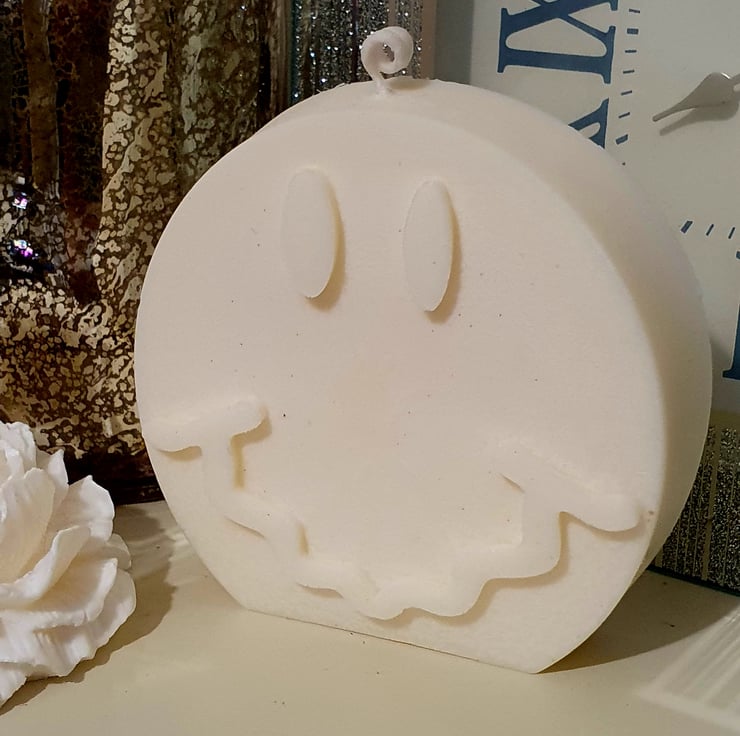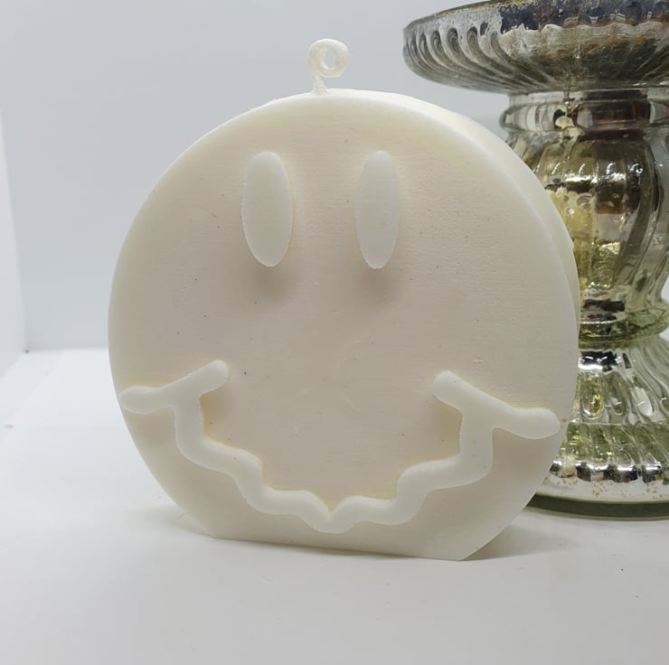 A gorgeous Scented Smiley Face Handmade Candle. Handpoured. Made with 100 % Soy Wax. Vegan. Eco Friendly Vanilla Fragrance. White .